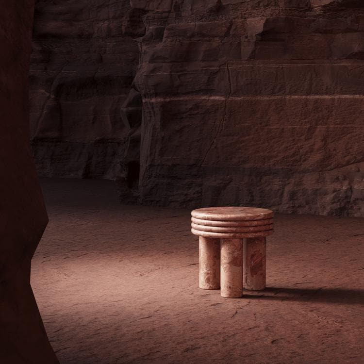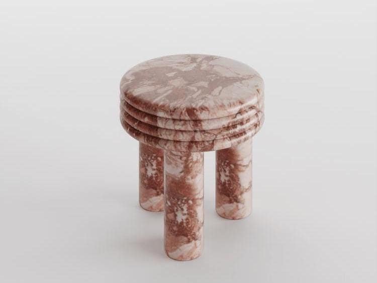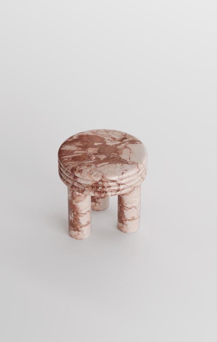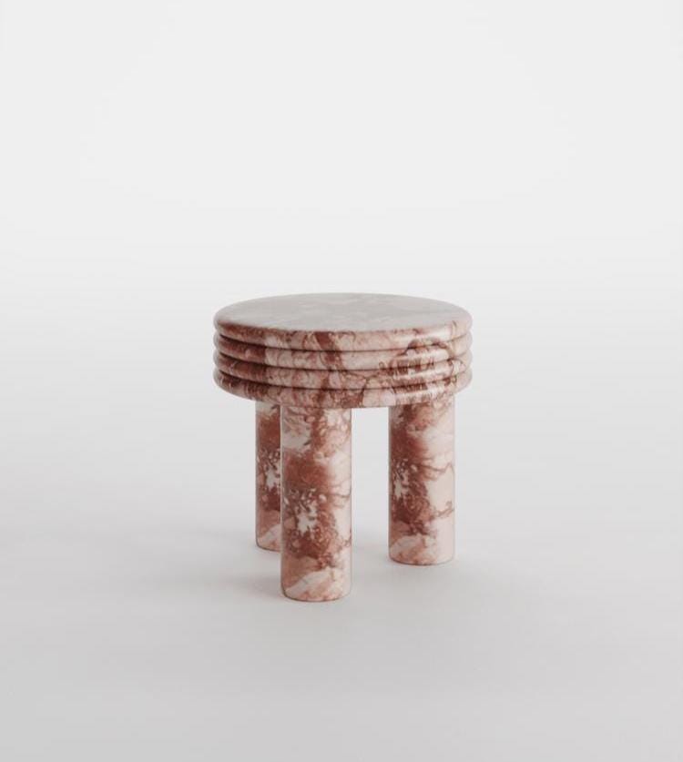 Sculpted from rare Breccia Pernice marble, this table features a captivating mix of earthy reds, warm beiges, and subtle veining, making it an unforgettable centerpiece in any setting. The smooth, round top is balanced on four cylindrical legs, with stacked ring detailing that adds architectural depth and visual harmony.