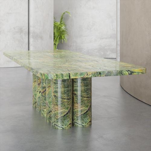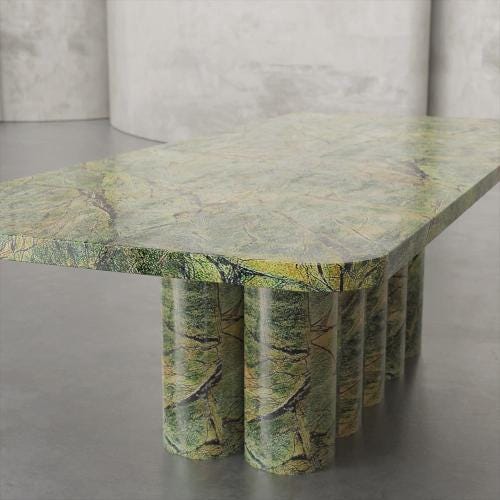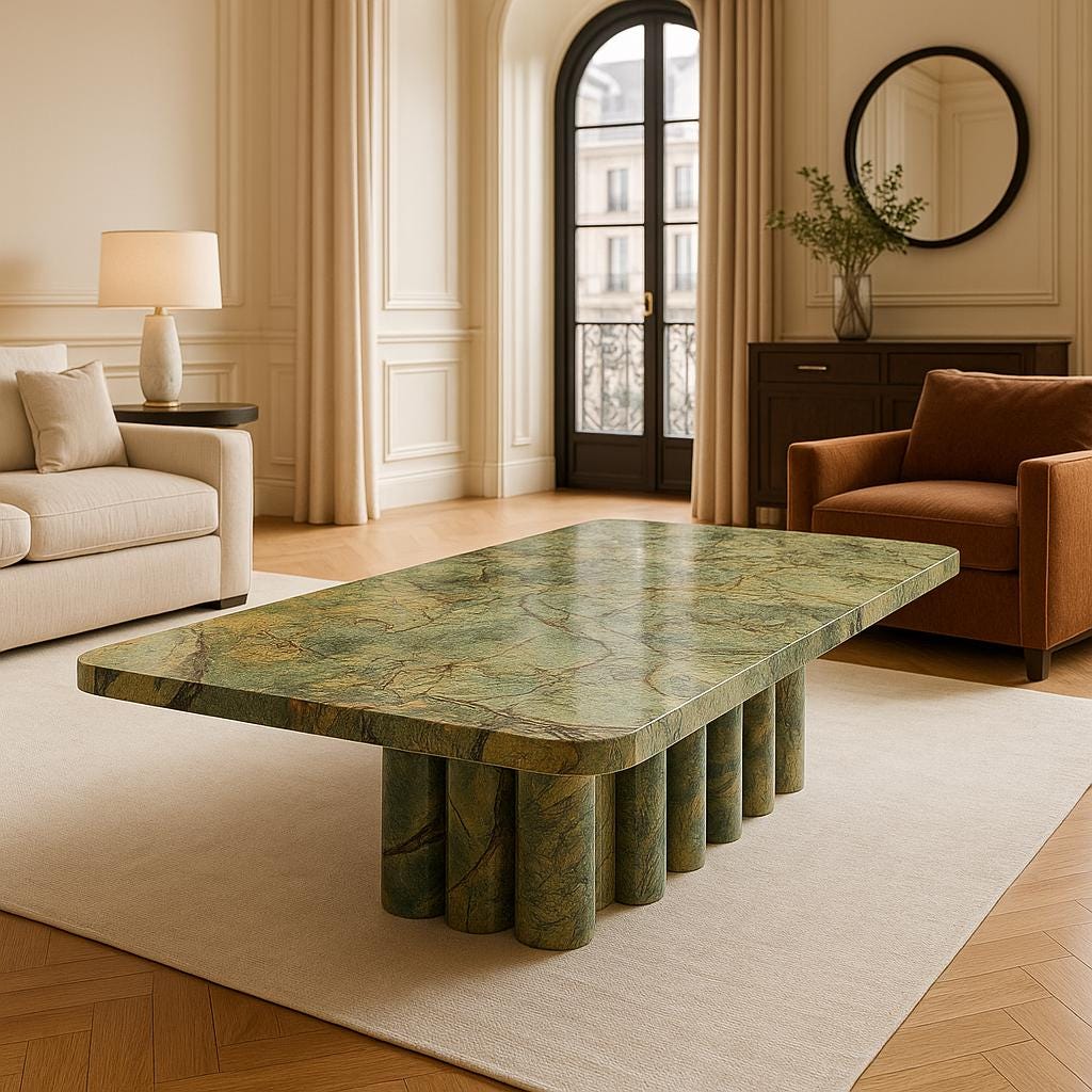 Indulge in the pinnacle of natural stone craftsmanship with this handmade dining table, a masterpiece that combines the soft warmth of Travertine, the deep elegance of Forest Green marble, and the bold sophistication of Nero Marquina marble. Each element is meticulously hand-selected and shaped by skilled artisans to create a piece that is as functional as it is artistic.