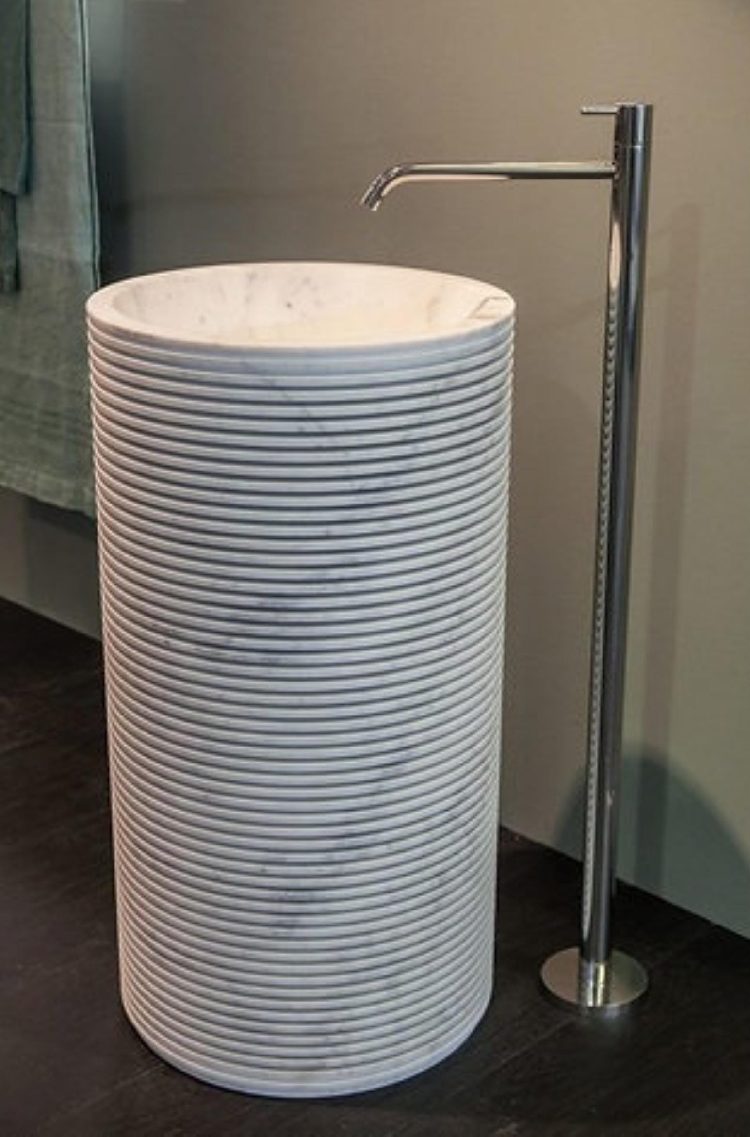 Modern White Marble Pedestal Sink: Ribbed Cylindrical Bathroom Basin