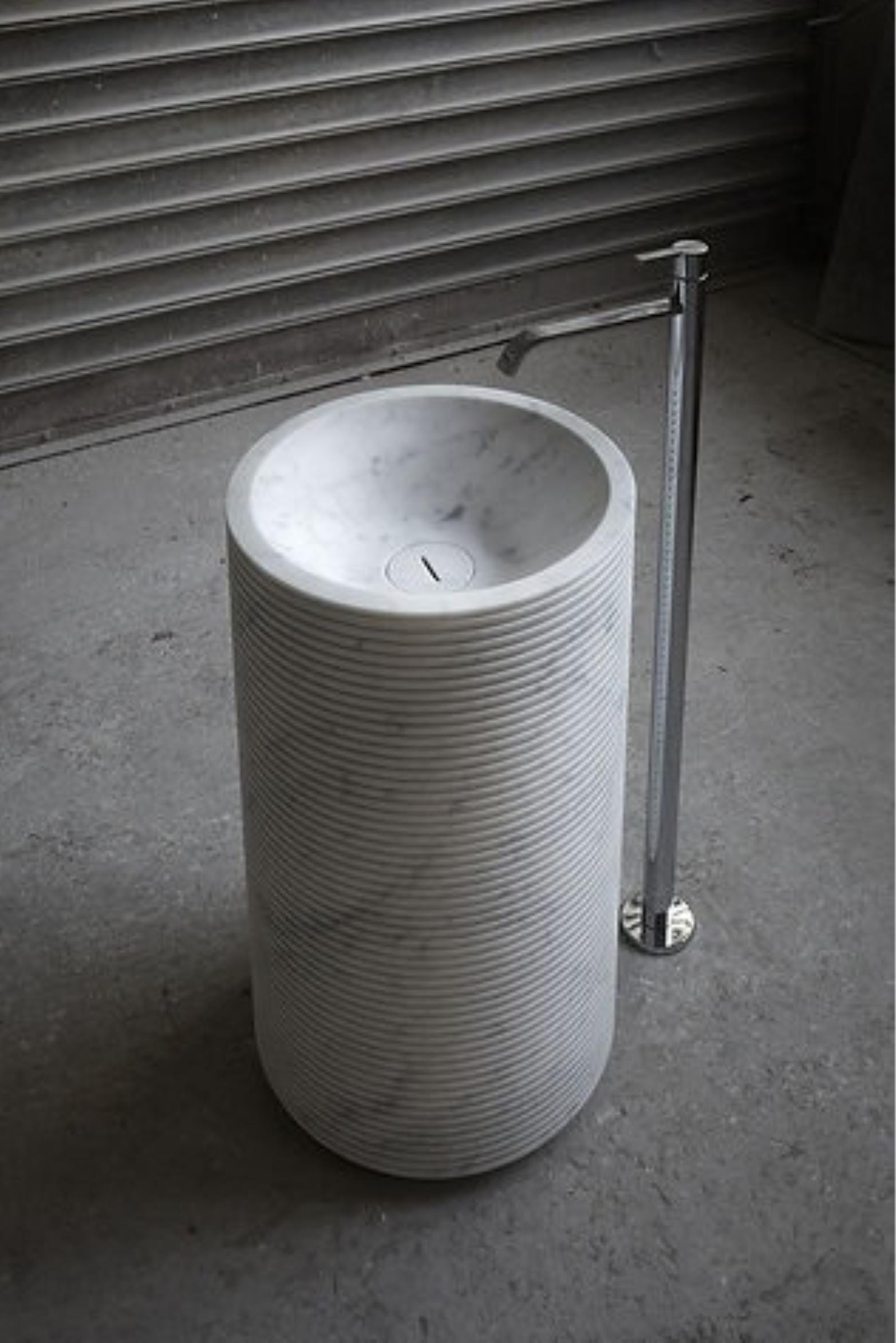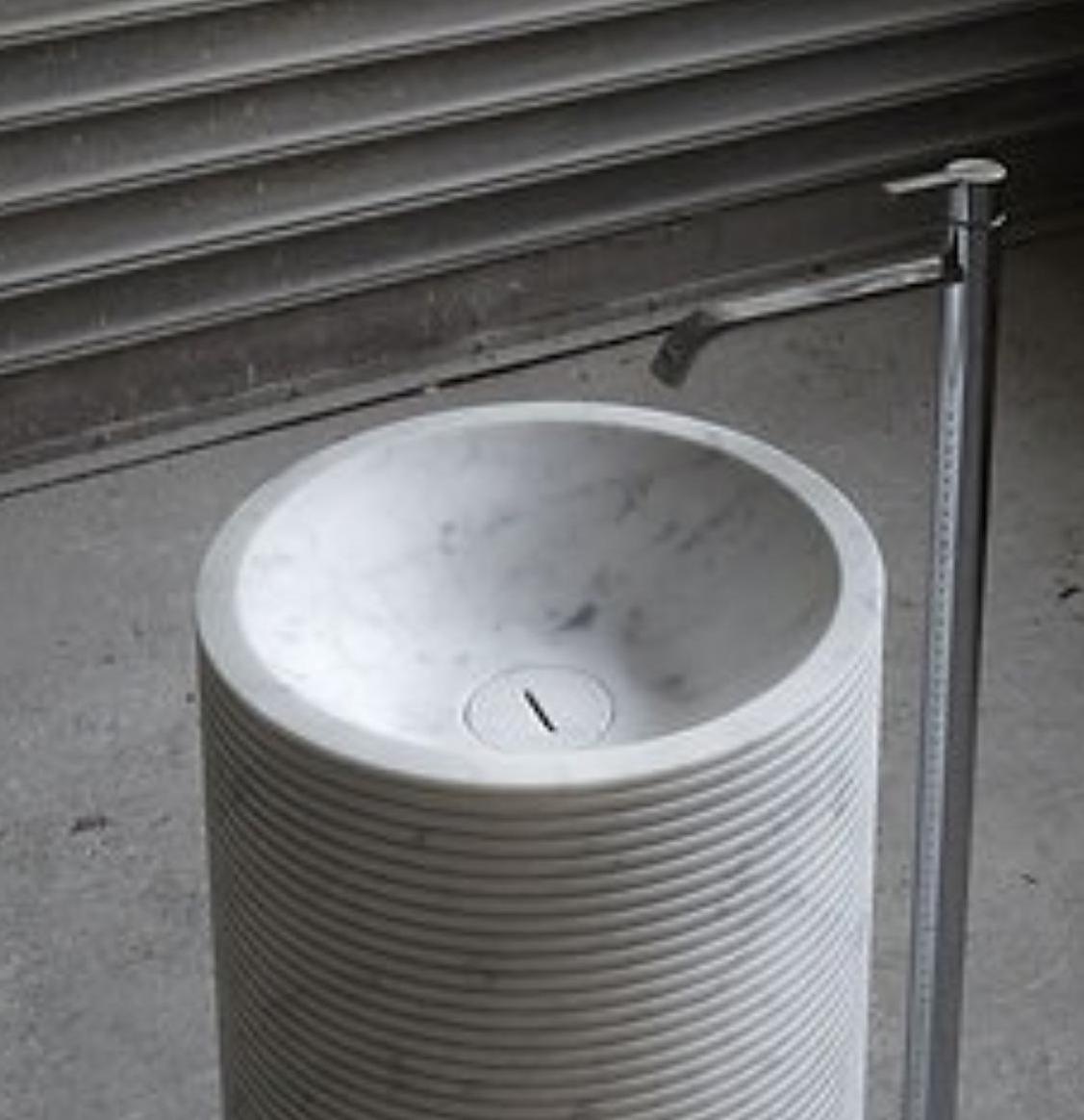 Elevate your bathroom with this modern freestanding marble pedestal sink, beautifully handcrafted from premium white marble. The cylindrical design features a striking ribbed texture that blends sculptural artistry with timeless elegance.