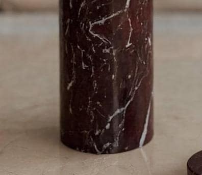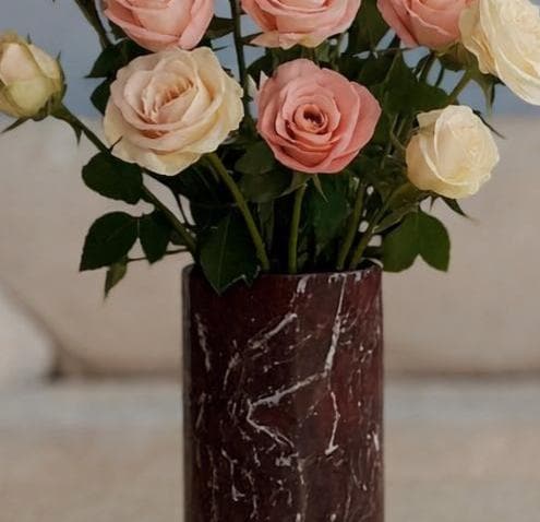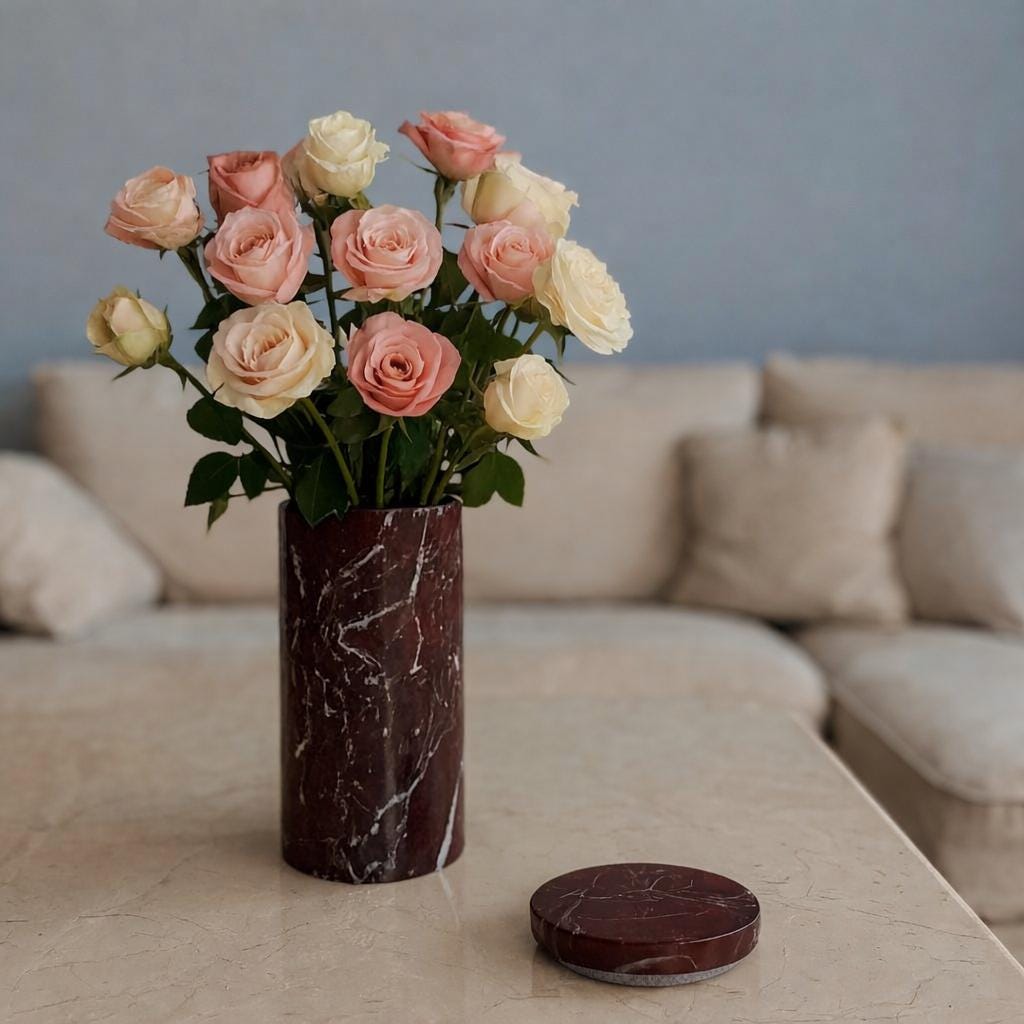 Elevate your home décor with this elegant set crafted from luxurious Rosso Levanto marble, a rare Italian stone known for its deep burgundy-red base and striking white veining. The tall cylindrical vase beautifully complements fresh or artificial flowers, while the round marble base with a silver deer figurine adds a refined artistic touch.