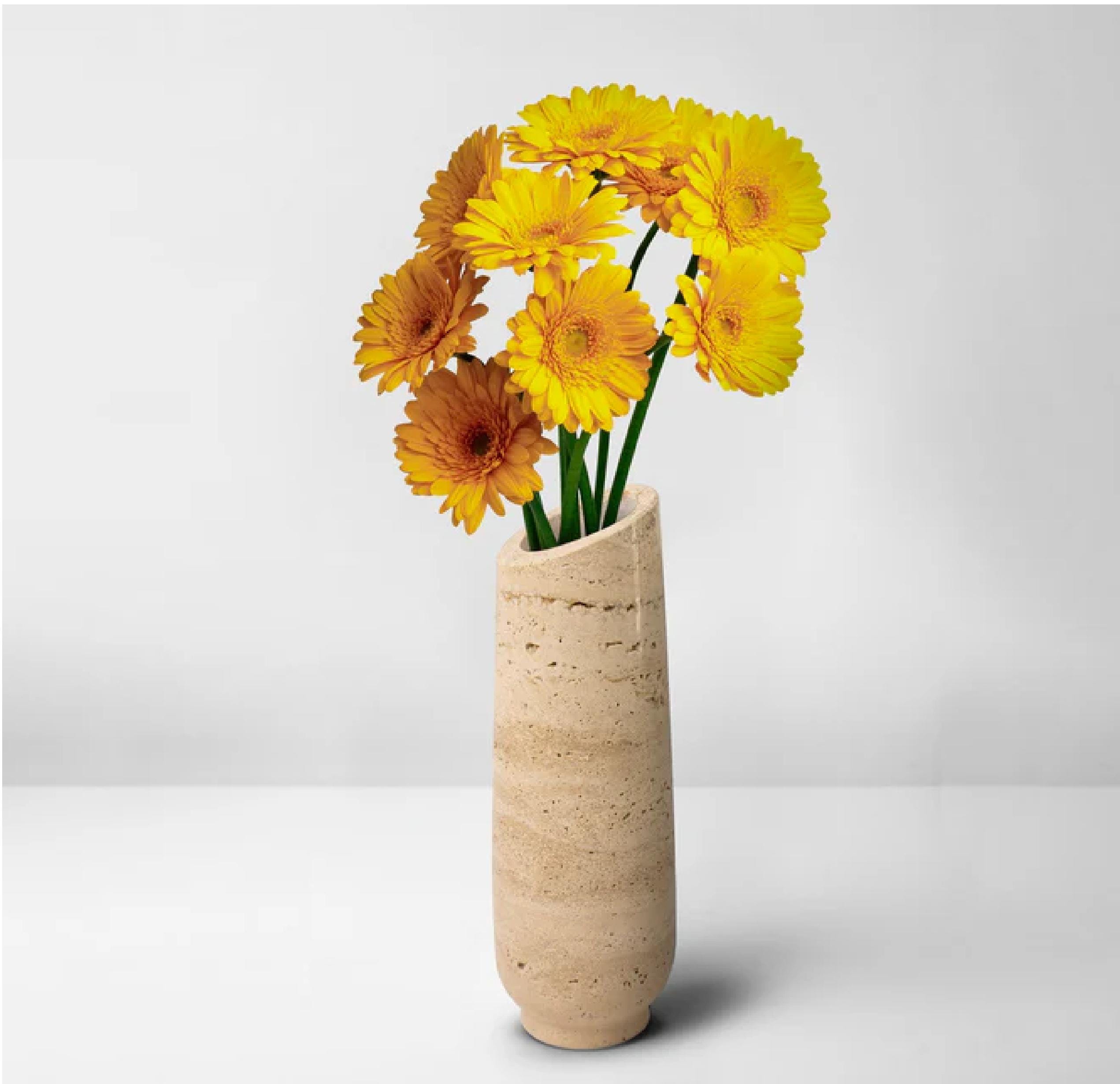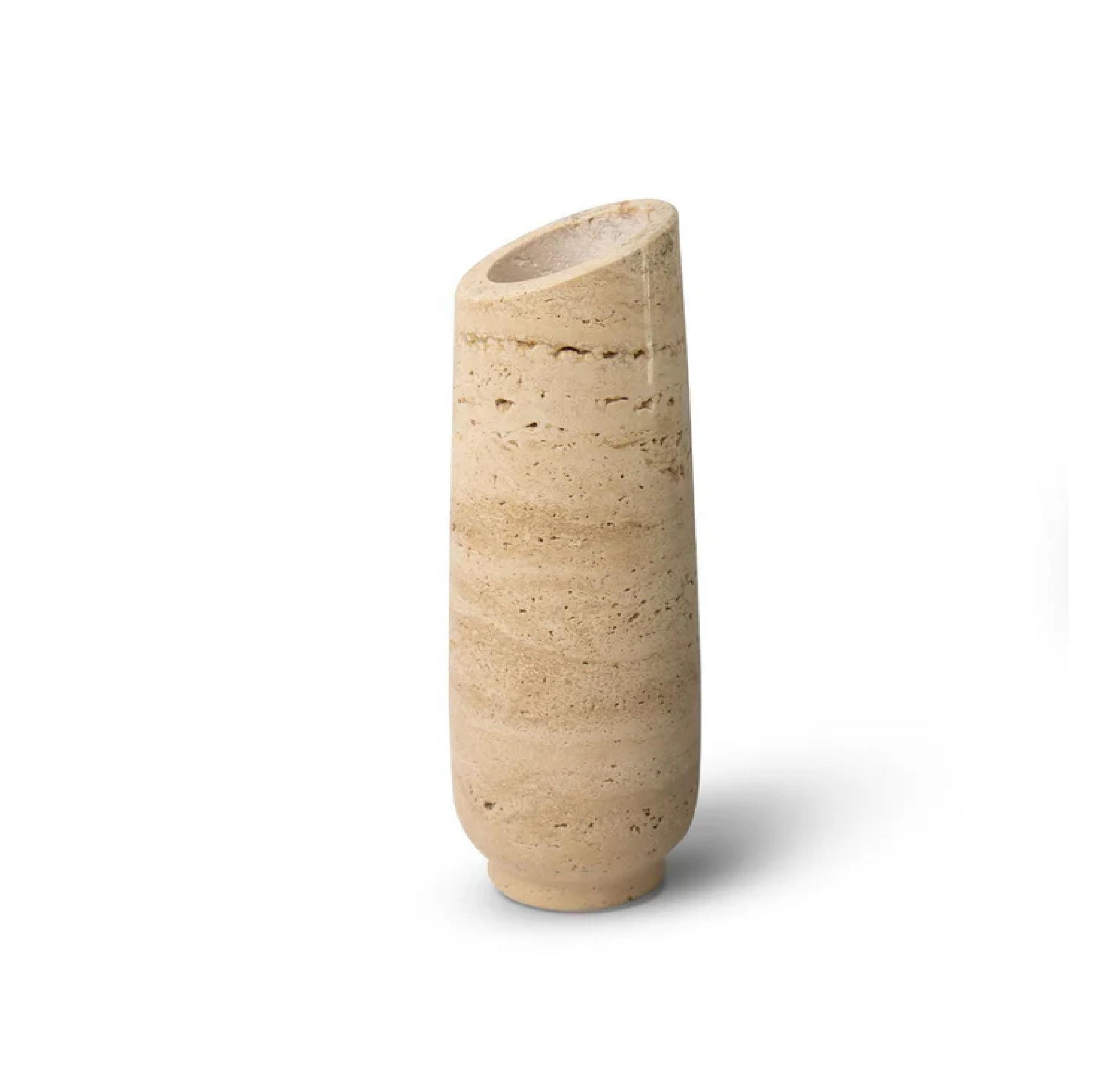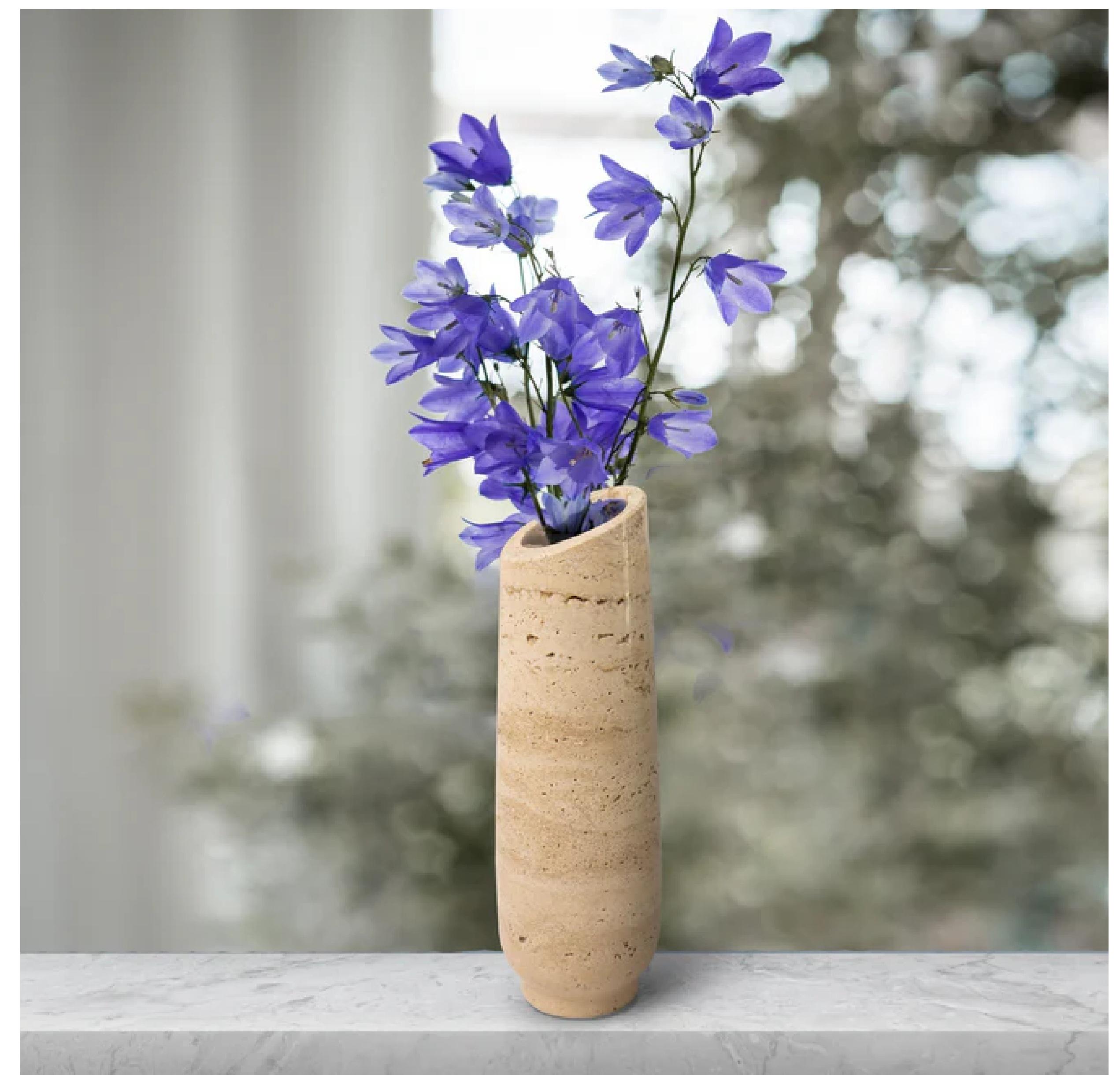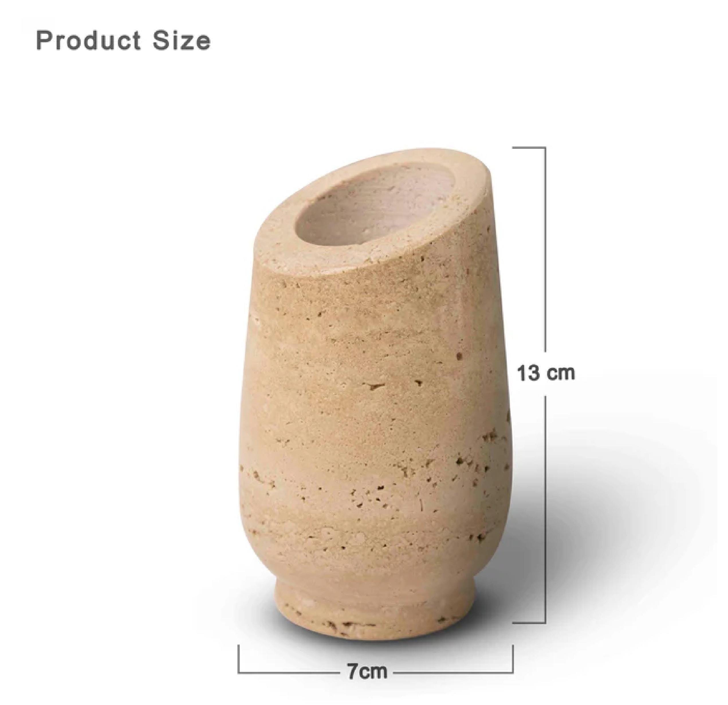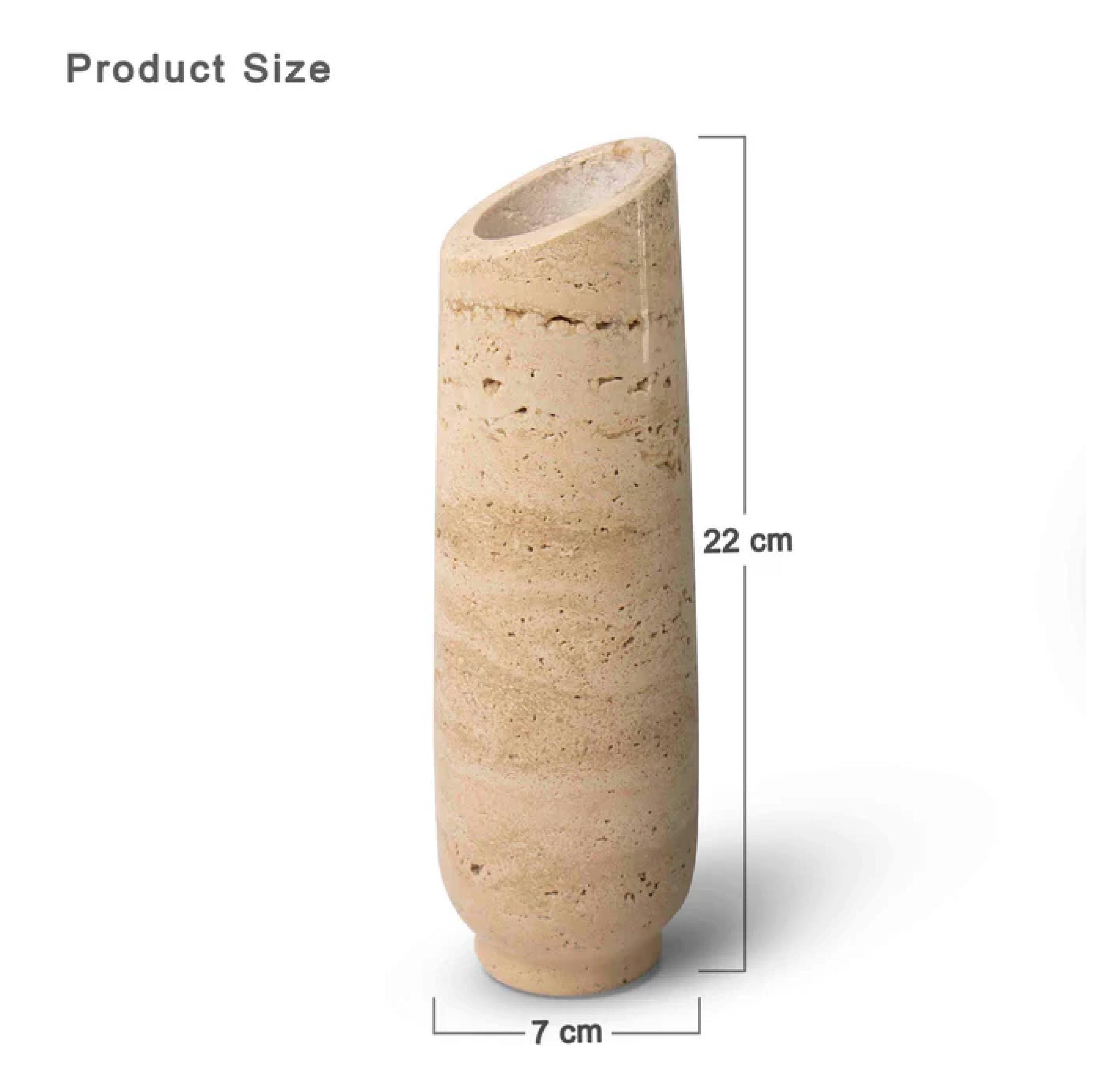 Bring timeless elegance into your home with this handcrafted travertine stone vase. Featuring the organic textures and earthy tones of natural travertine, this piece adds a touch of understated luxury to any space. Its sleek, asymmetrical design creates a modern yet warm aesthetic — perfect for both contemporary and rustic interiors.
