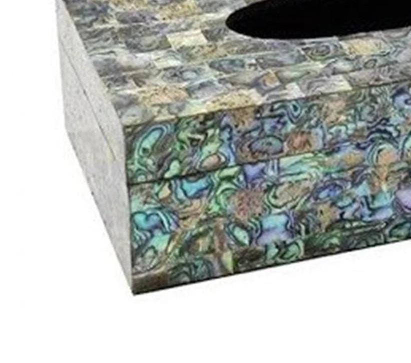 Bring coastal elegance into your home with this shimmering Abalone Shell Mosaic Tissue Box Cover. Designed with an iridescent shell-inspired pattern, this piece displays beautiful natural tones of teal, violet, gold, and ocean green. The glossy finish enhances the mosaic texture, allowing the colors to shift and shine as the light hits it—making it a standout décor piece in any room.