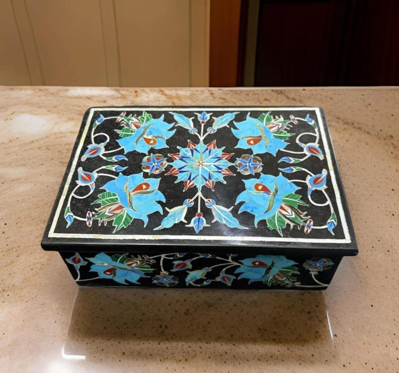 Add a touch of artisan elegance to your home with this stunning Turquoise Floral Inlay Jewelry Box. Each piece is carefully crafted with a rich black base and beautifully detailed turquoise floral inlay, creating a striking contrast that feels both luxurious and timeless. The hand-placed floral motifs feature vibrant blue petals, subtle stems, and intricate center details—turning this box into a miniature work of art.
