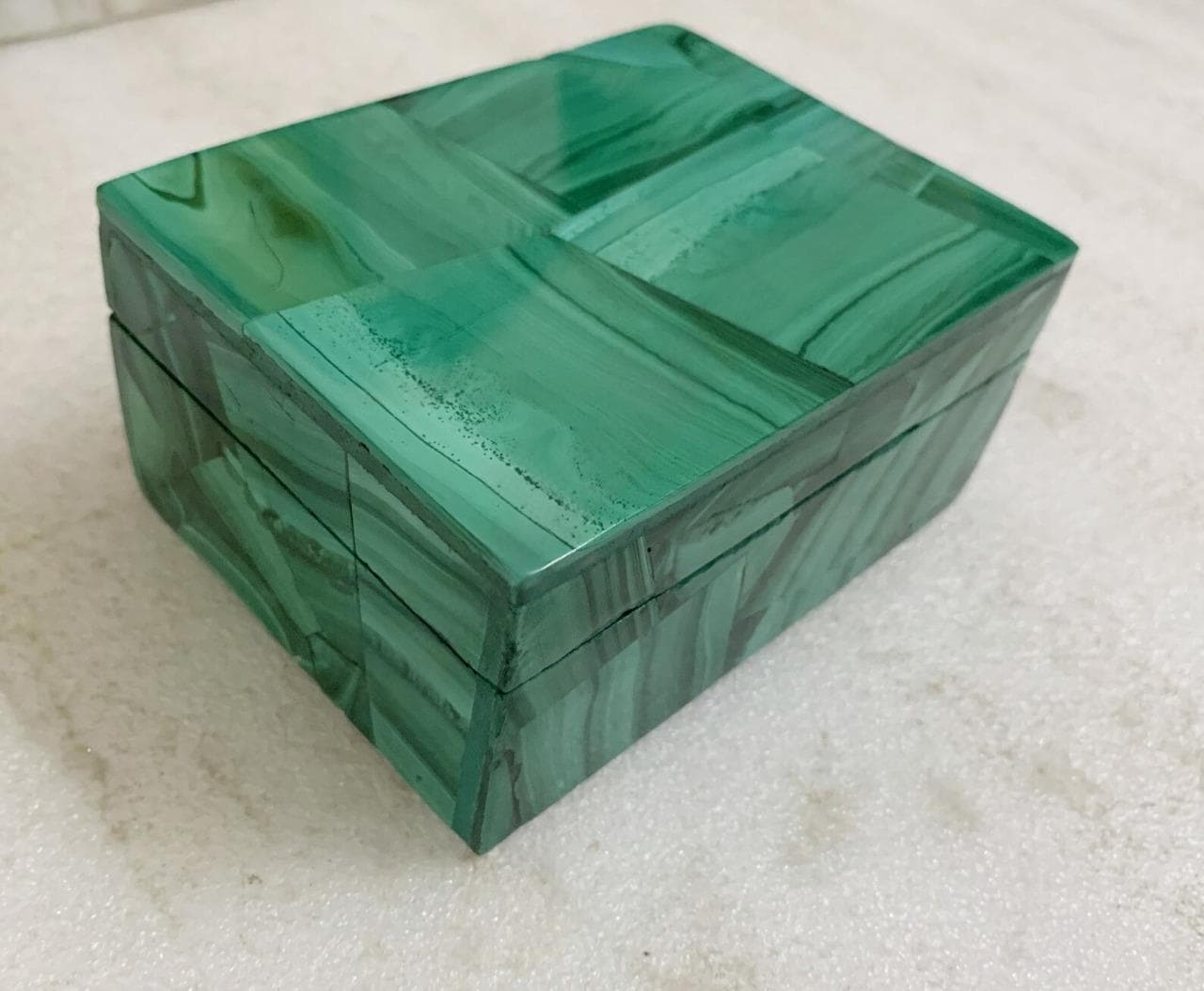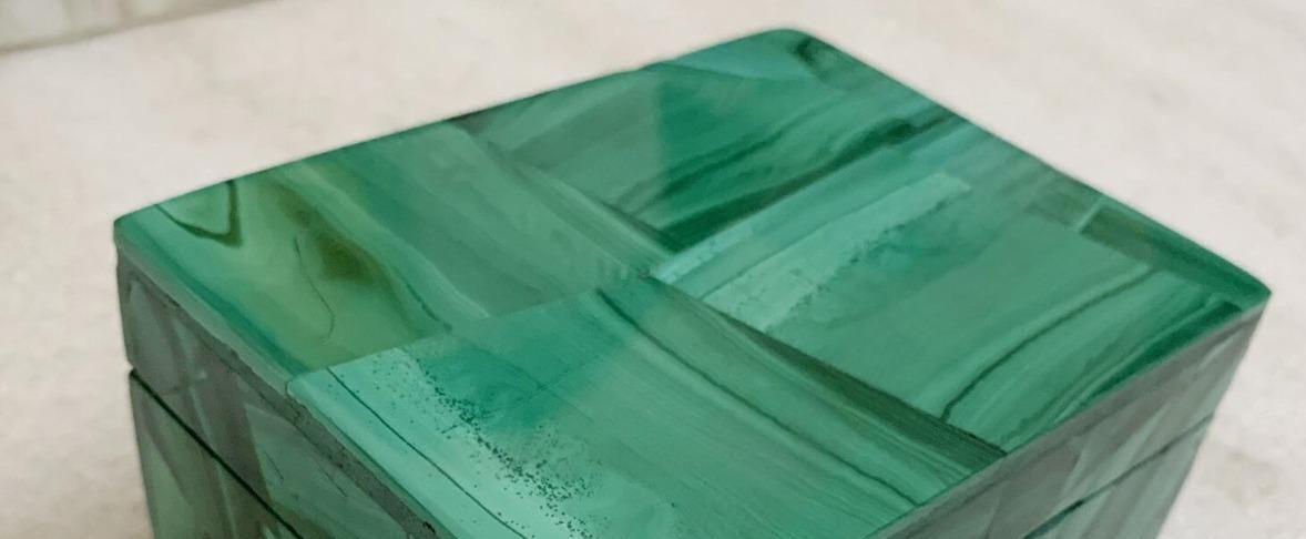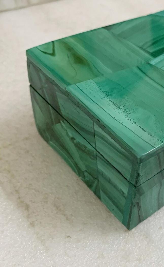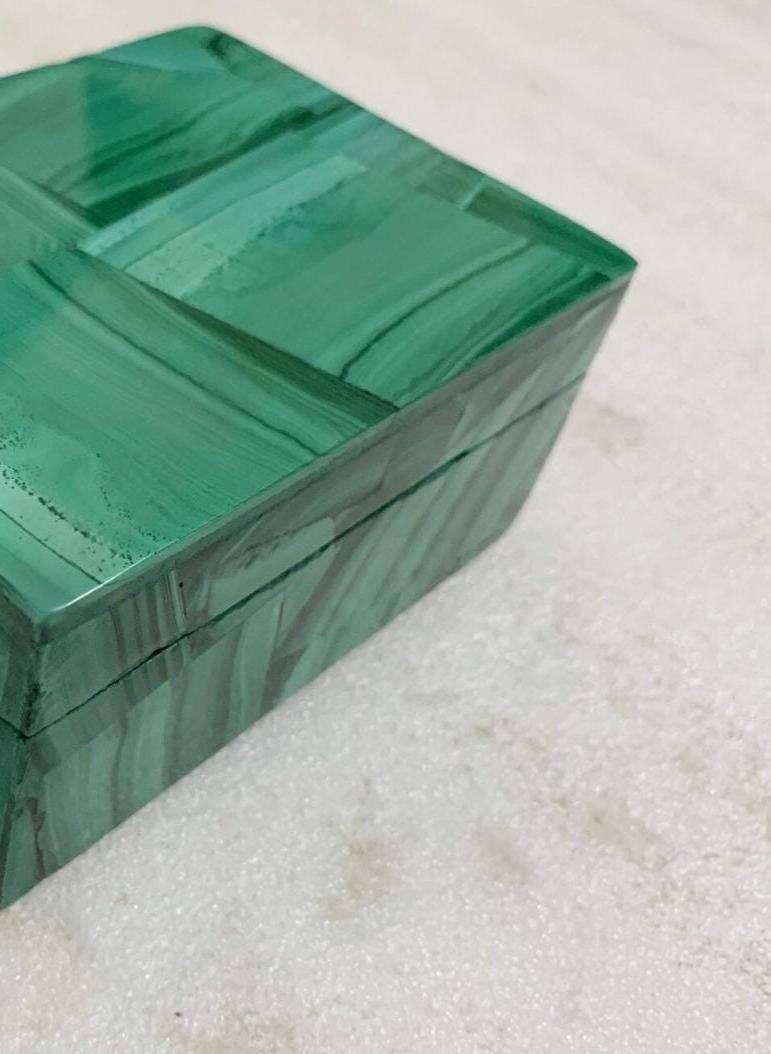 Perfect for storing jewelry, rings, crystals, keepsakes, small accessories, or sentimental items, this compact rectangular box offers both beauty and practical organization. The seamless design and polished surface highlight the striking malachite effect, bringing sophistication and color to any space.
