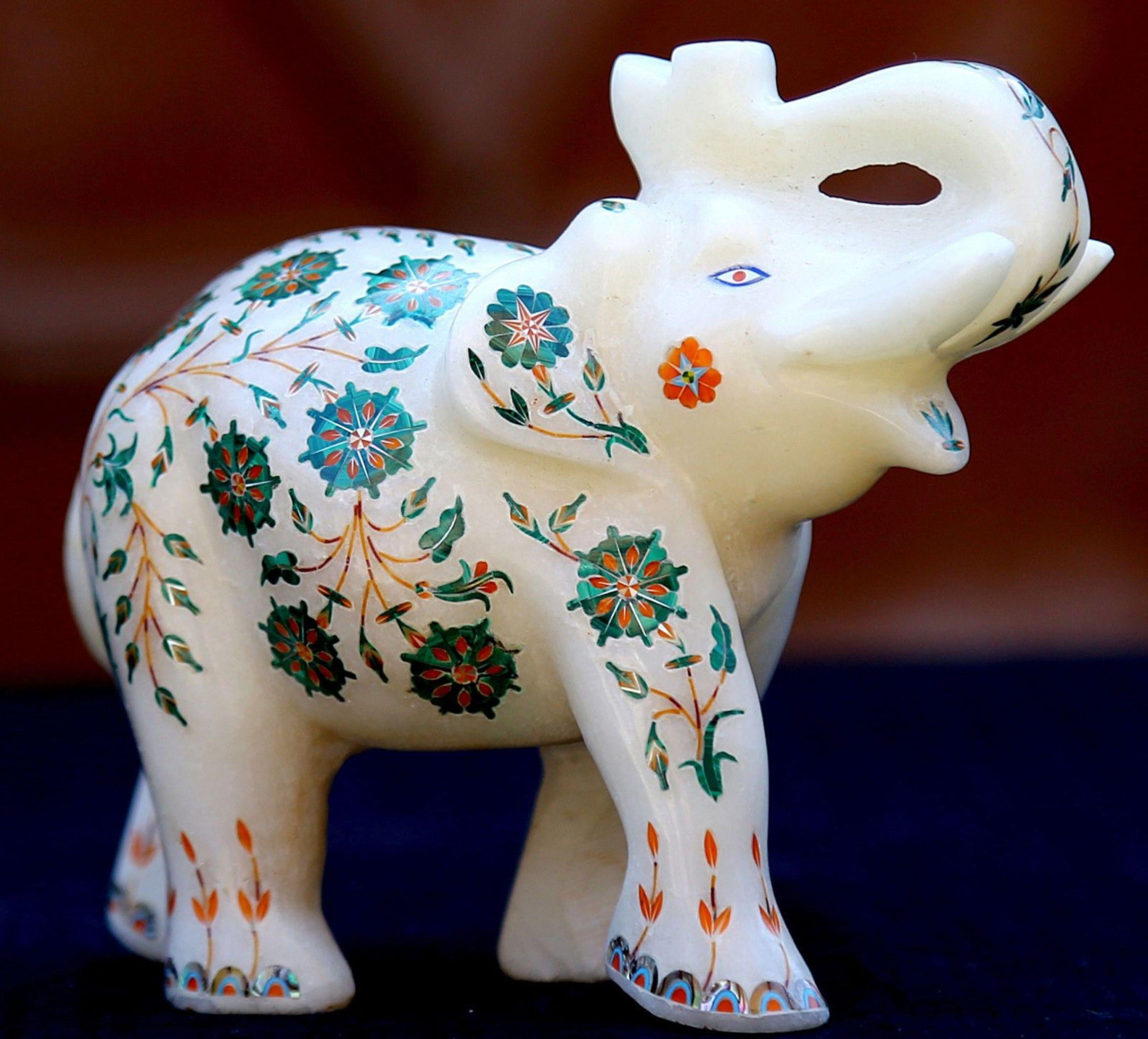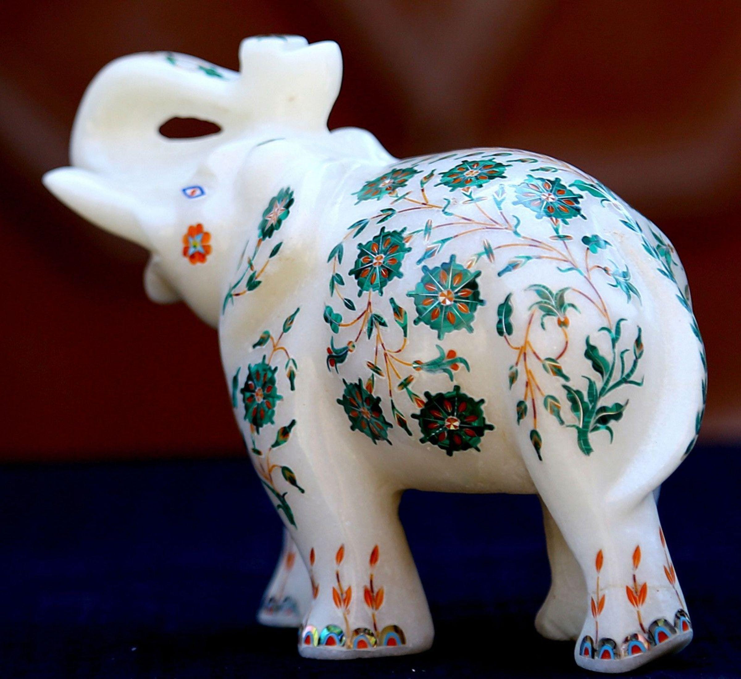 This exquisite marble elephant figurine is skillfully handcrafted and adorned with intricate floral inlay art. The delicate green and orange floral patterns bring the statue to life, showcasing the craftsmanship and attention to detail. Ideal as a decorative piece for home decor or as a gift, this marble elephant symbolizes strength, wisdom, and good fortune. The high-quality marble and vibrant inlay work make it a standout piece for any traditional or modern interior.