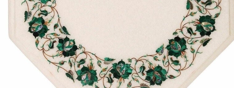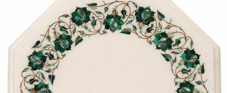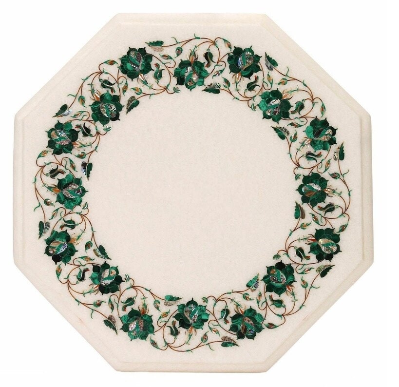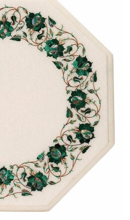 White Marble Octagonal Tabletop with Handcrafted Green Floral Pietra Dura Inlay – Semi-Precious Stone Art