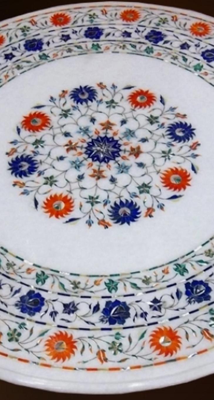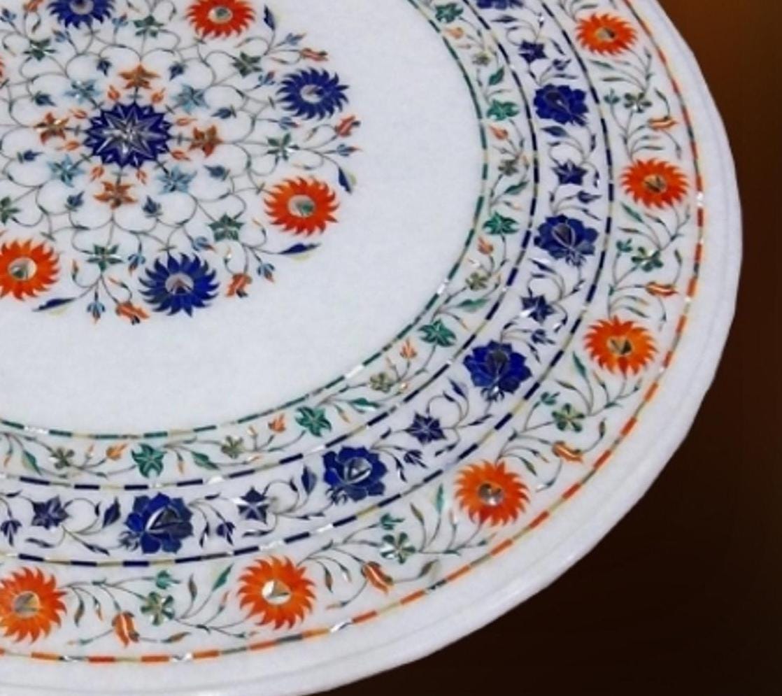 Enhance your living space with this stunning handcrafted round marble inlay tabletop, a beautifully detailed work of traditional Pietra Dura craftsmanship. Made from premium white marble, this piece features a vibrant multicolor floral design meticulously created using semi-precious stone inlays.