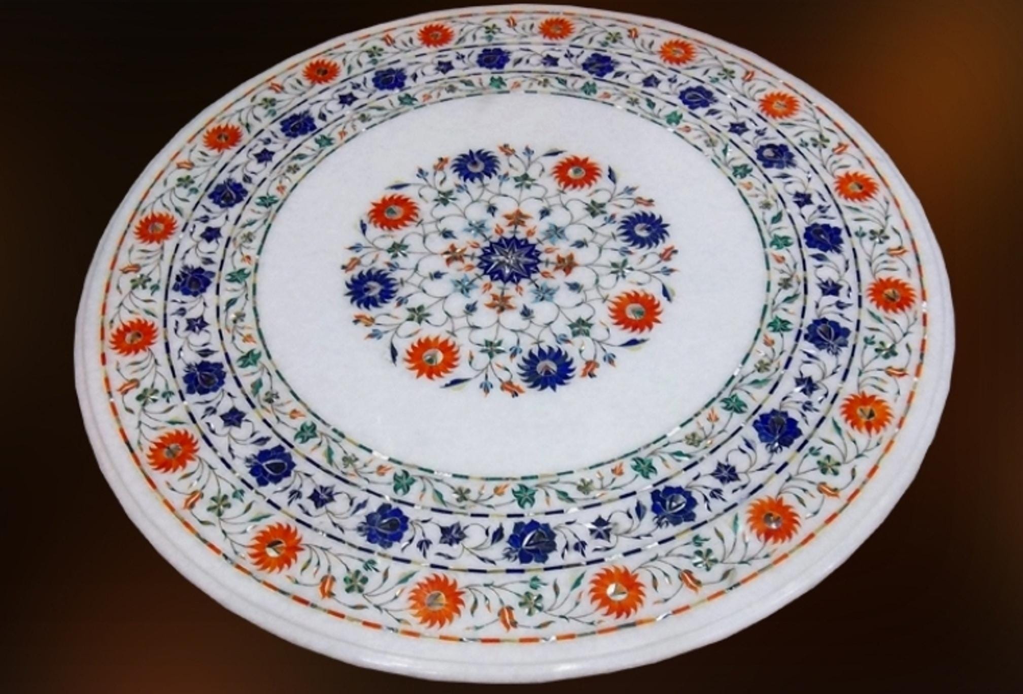 The central medallion blossoms outward with intricate orange, blue, and green floral motifs, framed by two richly decorated circular borders that add depth and symmetry. Each flower and leaf is cut by hand from natural stones such as lapis lazuli, carnelian, jasper, and malachite, then inlaid seamlessly into the marble surface through a process perfected by Mughal artisans centuries ago.