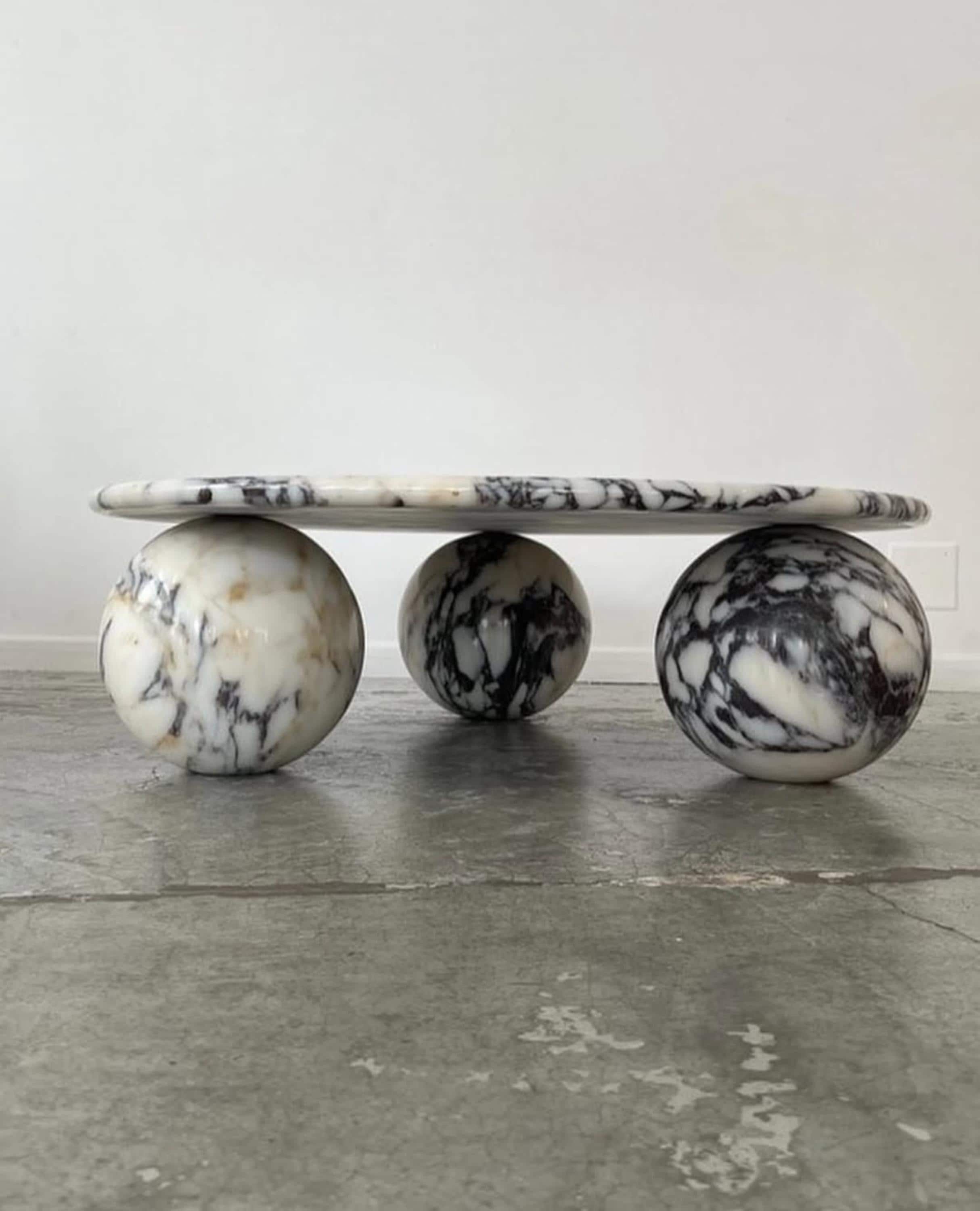 The design showcases a smooth, hand-polished marble top supported by three solid Calacatta marble spheres, each carved and shaped with precision. The round architectural spheres not only provide exceptional stability but also introduce a sculptural elegance that sets this piece apart from ordinary furniture.