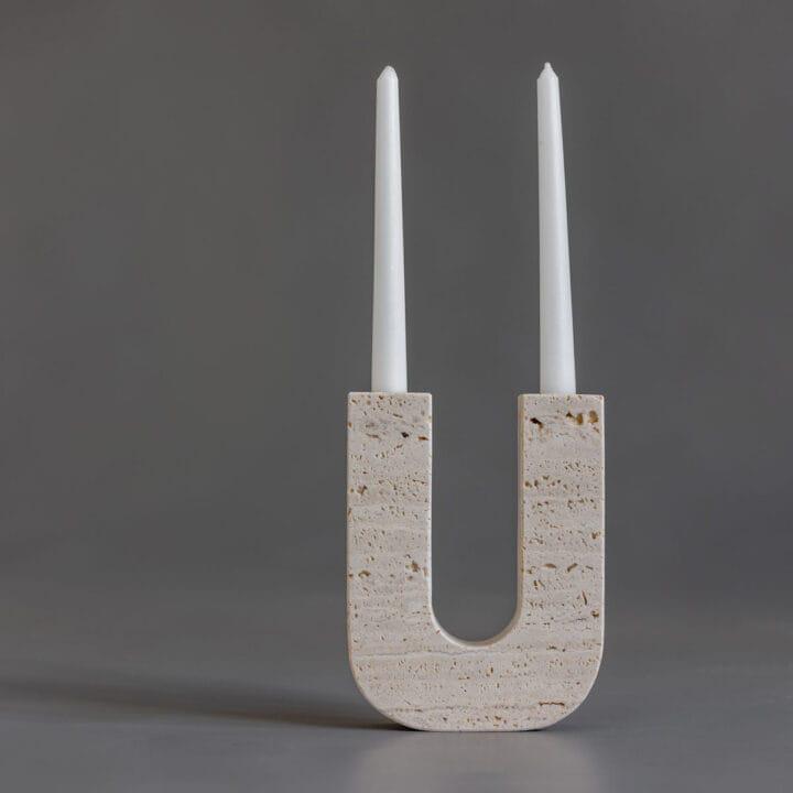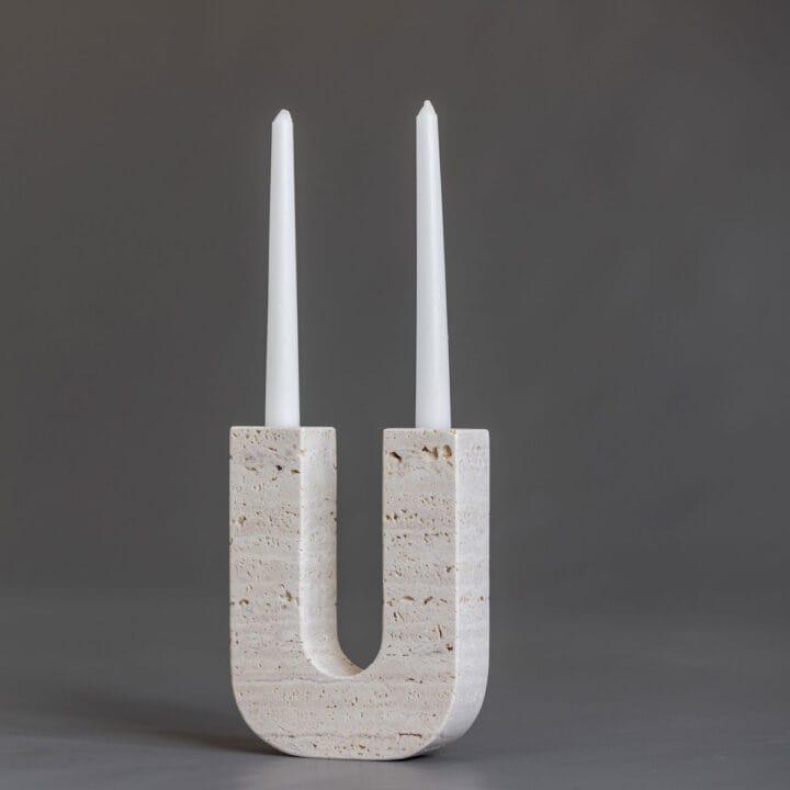 Travertine U-Shaped Candle Holder – Modern Stone Taper Holder, Minimalist Sculptural Decor