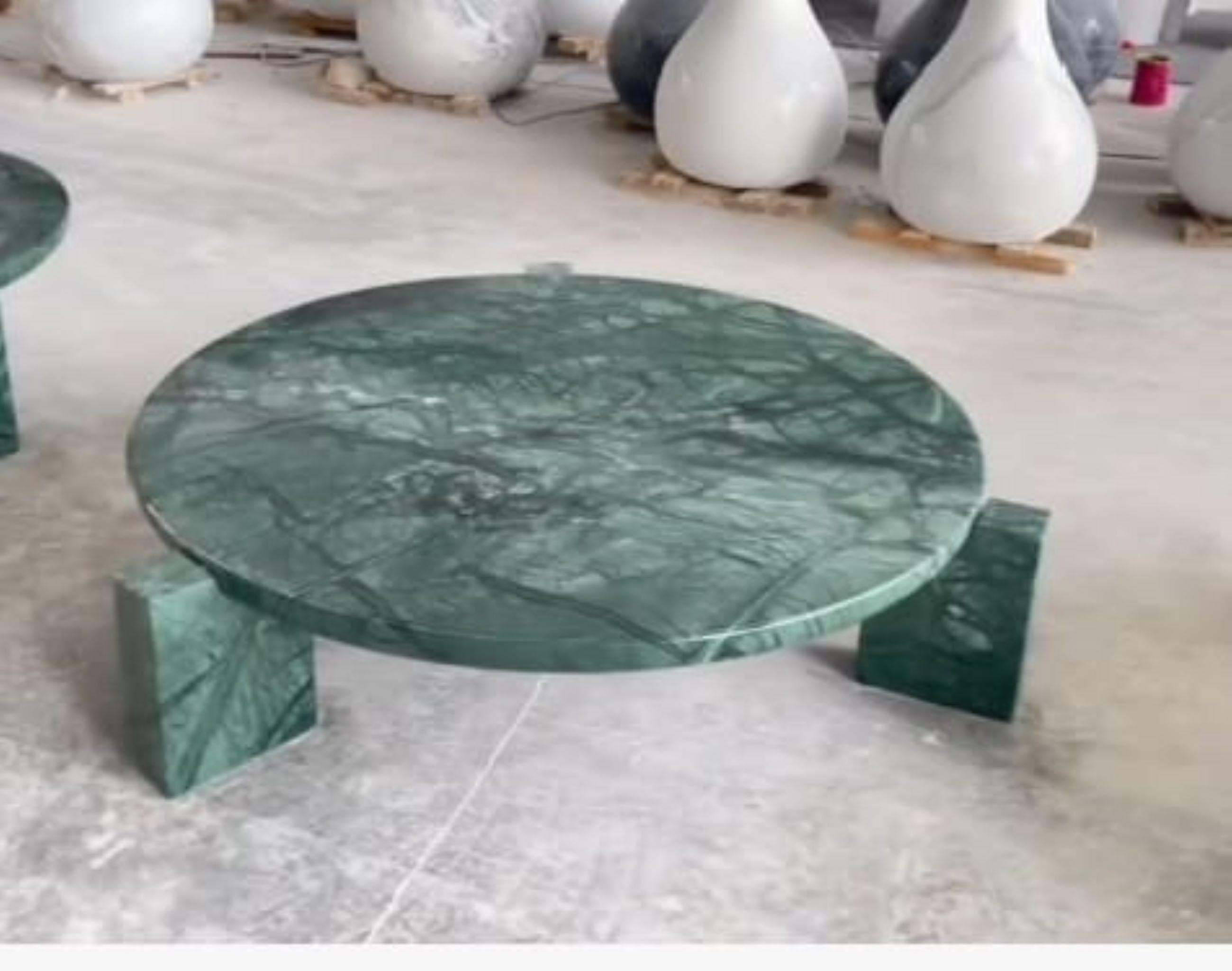 Make a bold design statement with this handcrafted green marble coffee table, where natural stone meets modern sculptural form. Featuring a round, polished marble tabletop with striking natural veining, this table rests on solid rectangular marble legs that create a strong yet refined architectural presence.