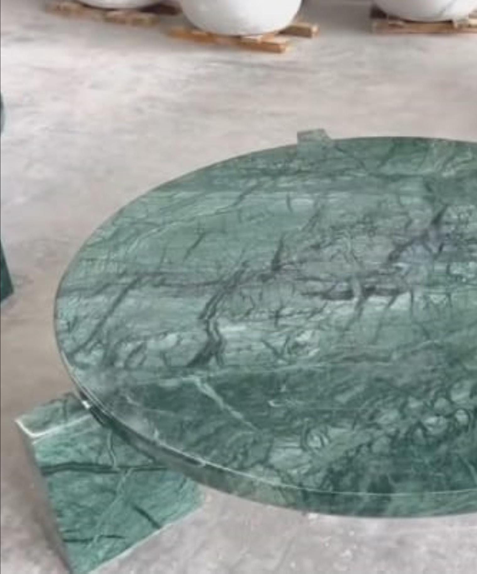 Each table is individually handcrafted from natural marble, showcasing unique variations in color, pattern, and veining—ensuring that no two pieces are exactly alike. The smooth, polished surface highlights the depth and movement of the green marble, while the solid stone base provides both durability and timeless elegance.