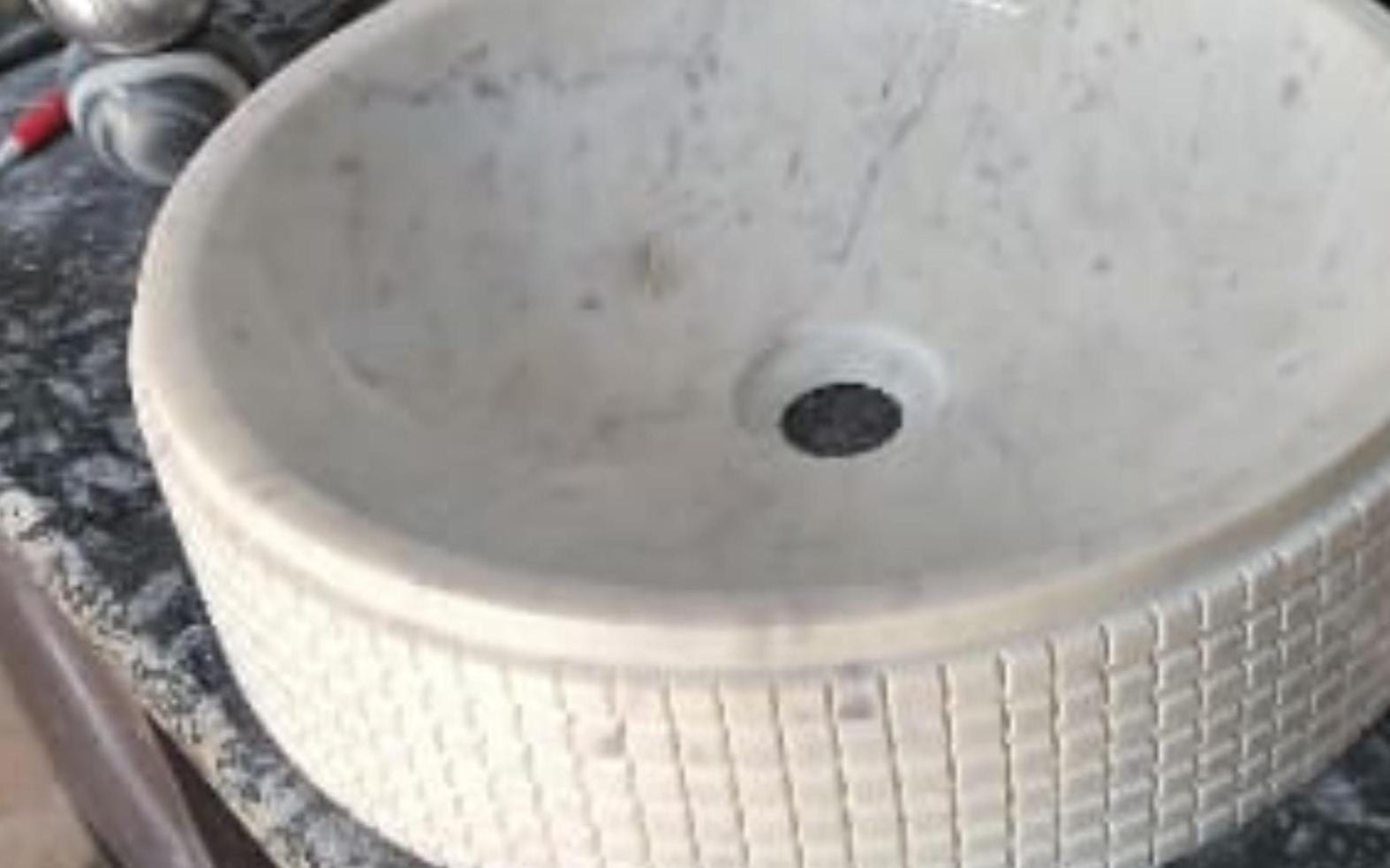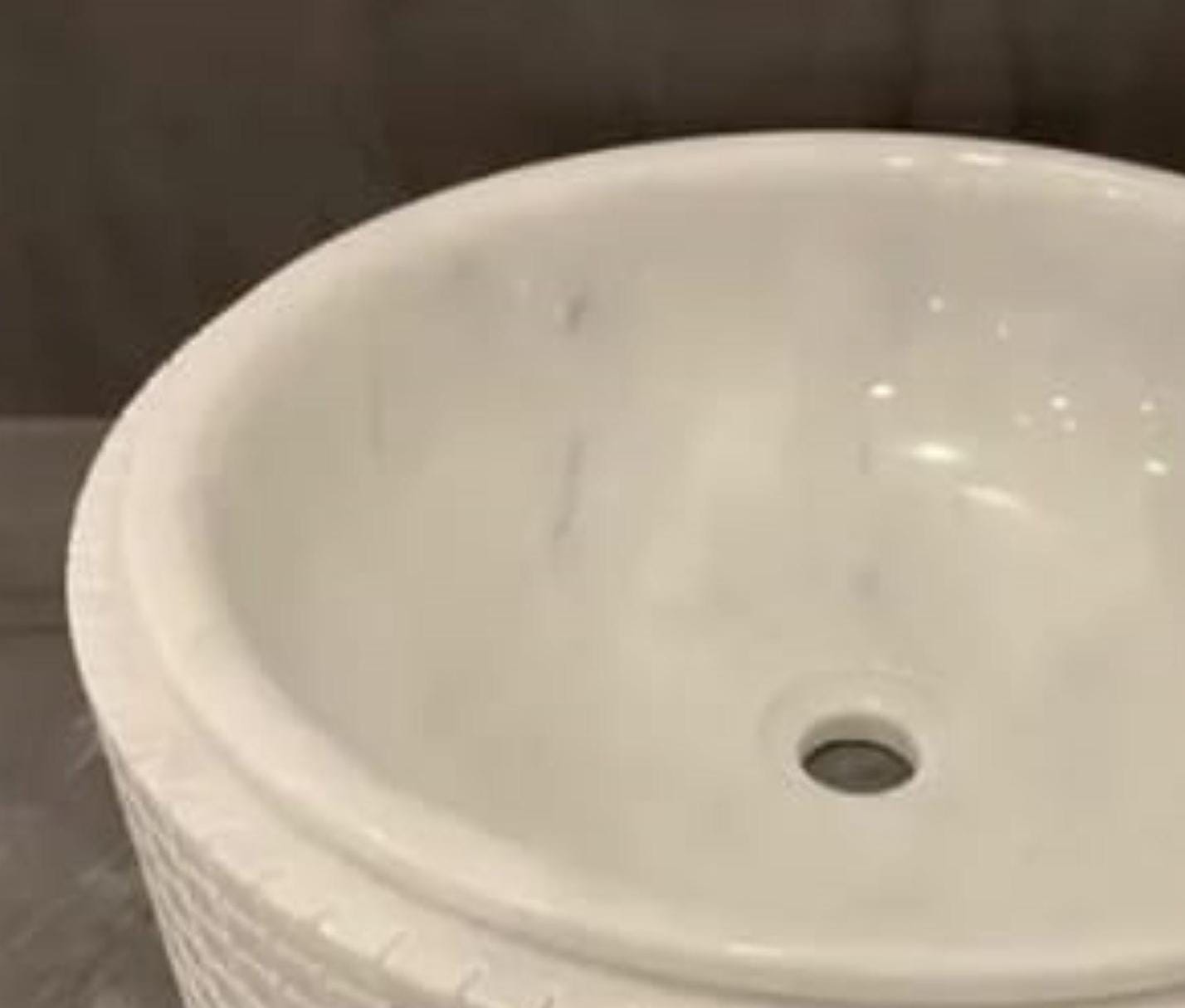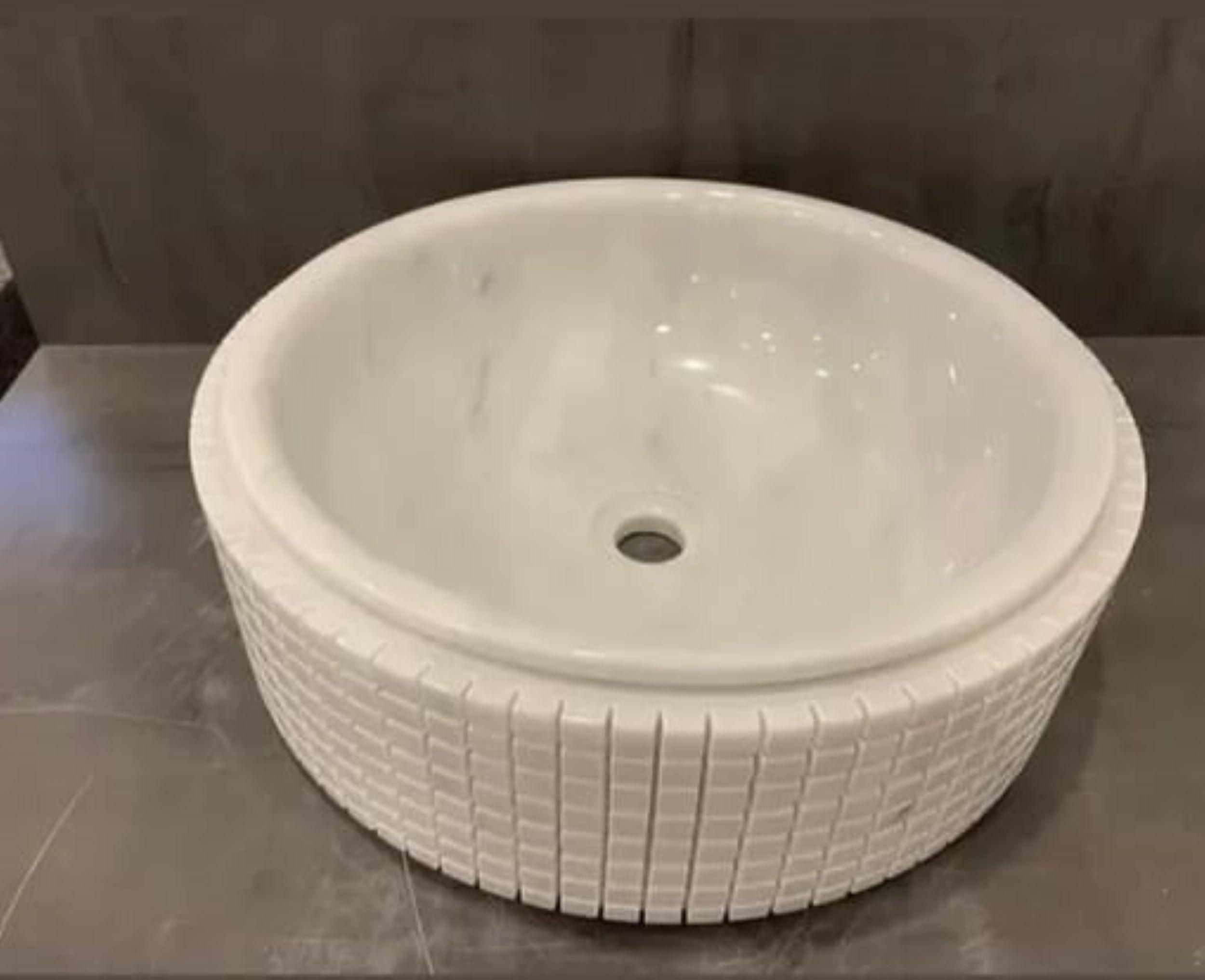 Elevate your bathroom with timeless elegance using this handcrafted white marble vessel sink. Expertly carved from solid natural stone, this round countertop basin features a smooth, polished interior paired with a subtly textured exterior, creating a perfect balance between modern design and artisanal craftsmanship.