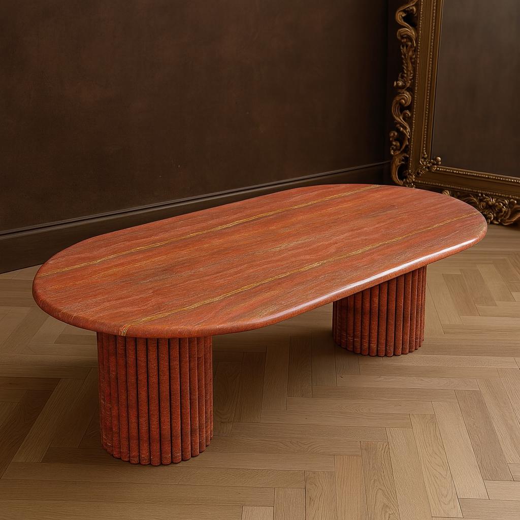Indulge in the pinnacle of natural stone craftsmanship with this handmade dining table, a masterpiece that unites the warm vibrance of Red Travertine, the classic elegance of Beige Travertine, and the bold sophistication of Nero Marquina marble. Each element is hand-selected and precision-shaped by skilled artisans to create a table that is both functional and artistic—a true statement centerpiece for refined interiors.