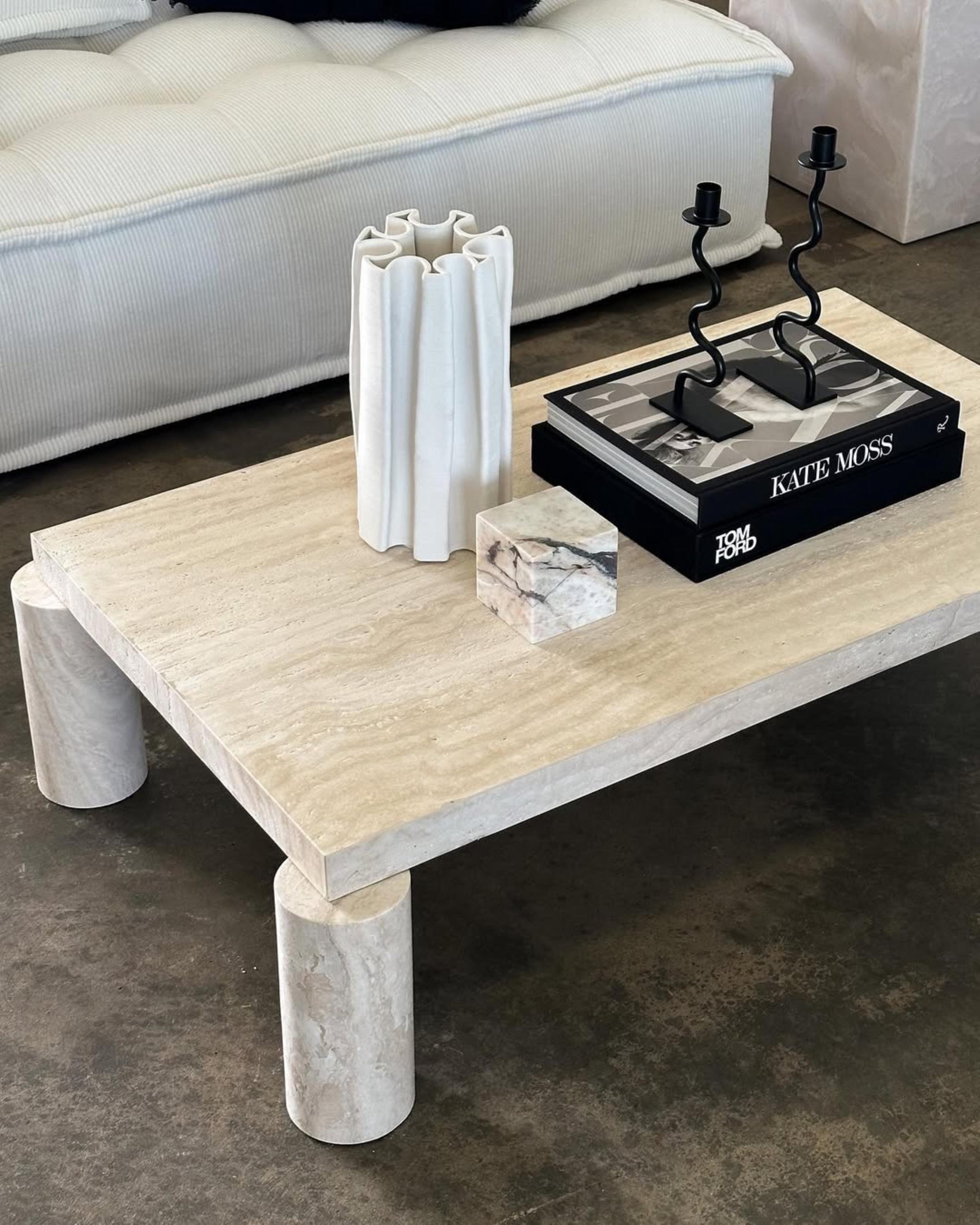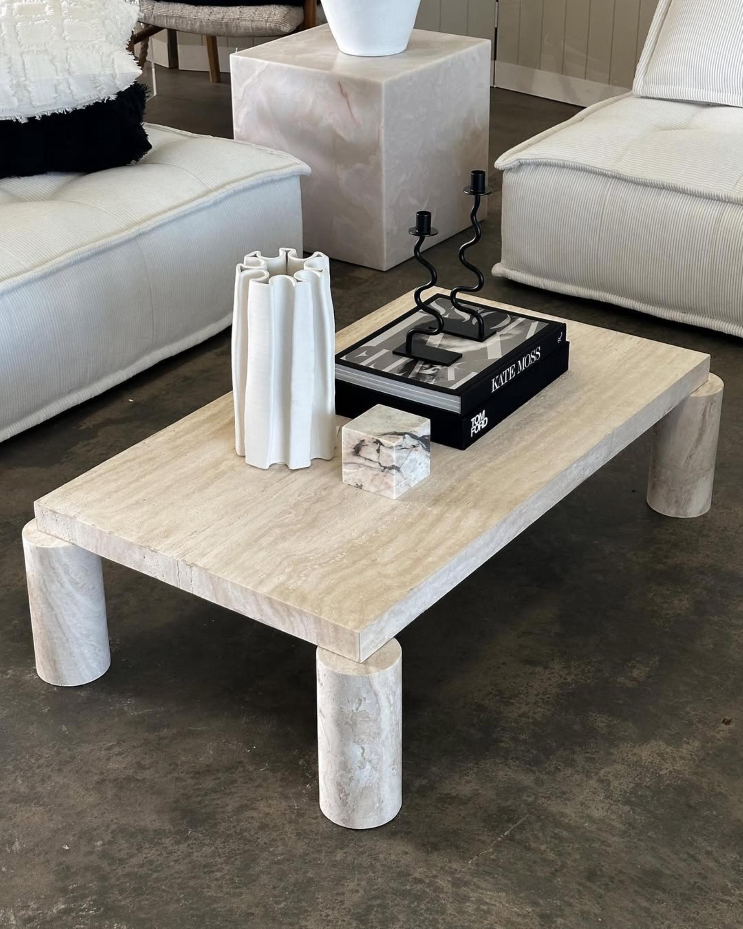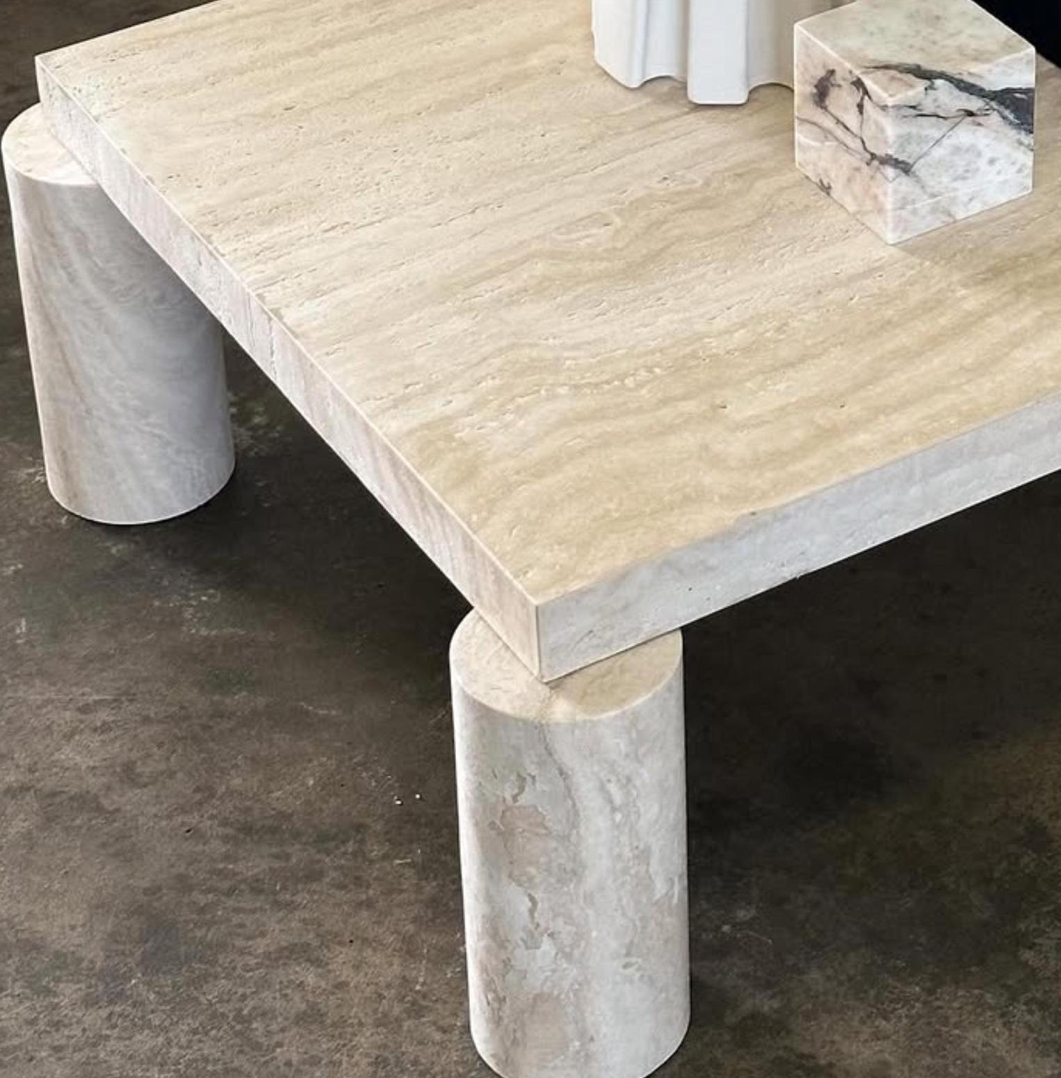 Bring contemporary elegance into your home with this handcrafted travertine coffee table, designed with a minimalist rectangular top and distinctive round column legs. Its clean lines, natural texture, and timeless appeal make it a statement piece for any modern or transitional interior.