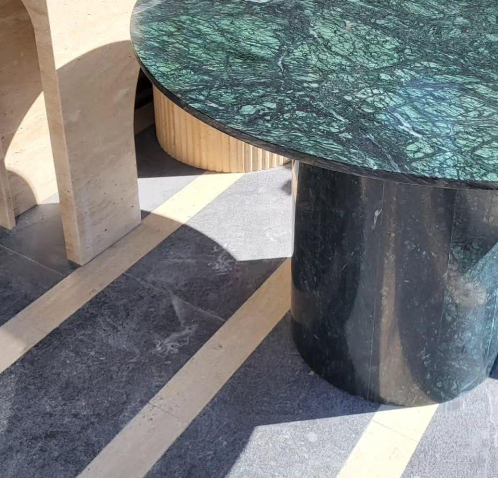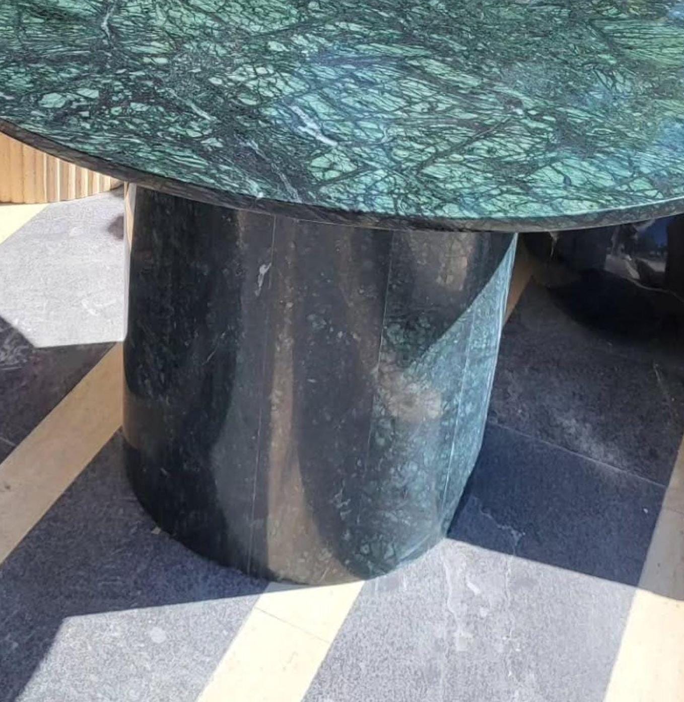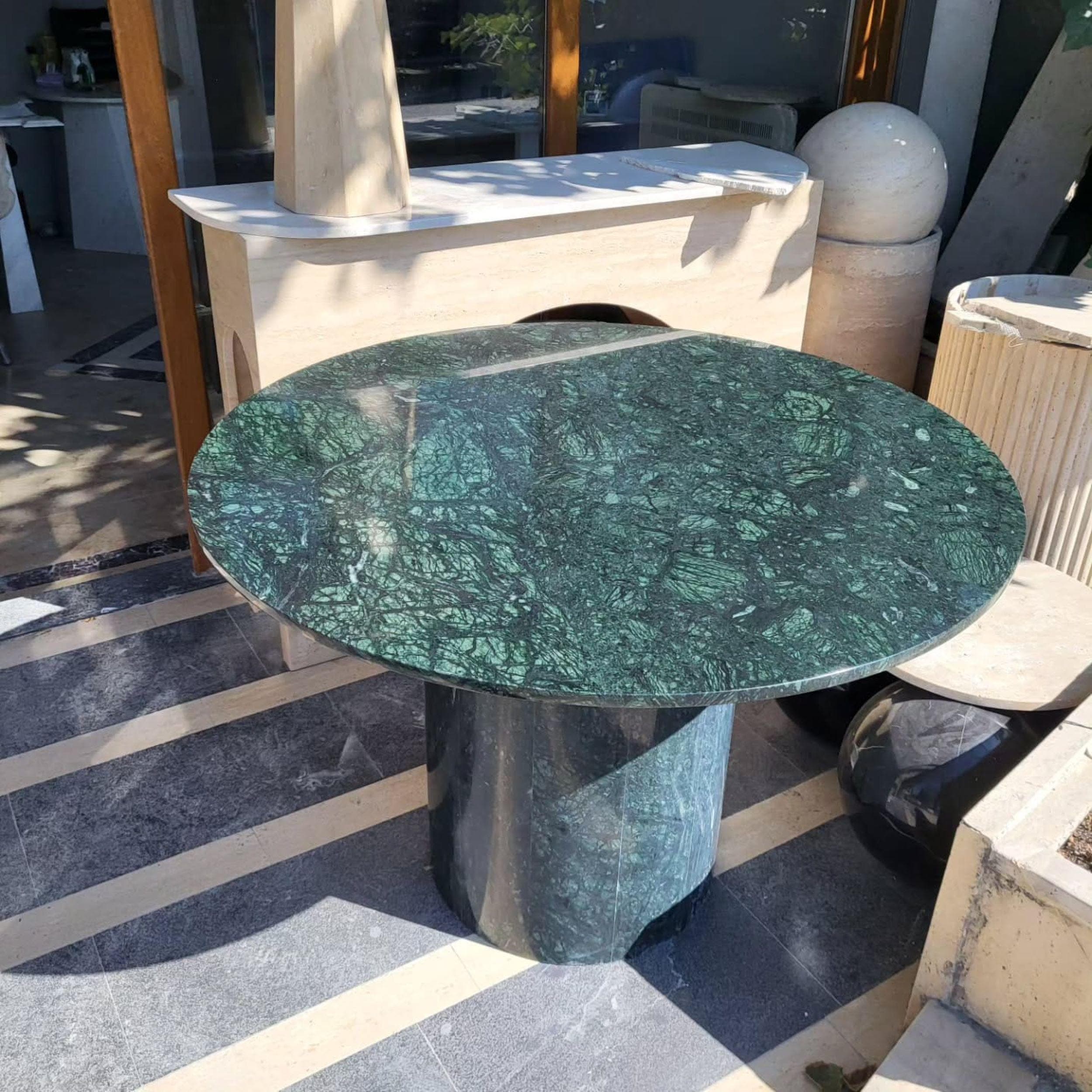 This striking green marble bistro table is a timeless statement piece crafted from solid natural stone. Featuring a round, richly veined green marble top paired with a matching cylindrical pedestal base, this table blends classic Italian elegance with modern sculptural form.