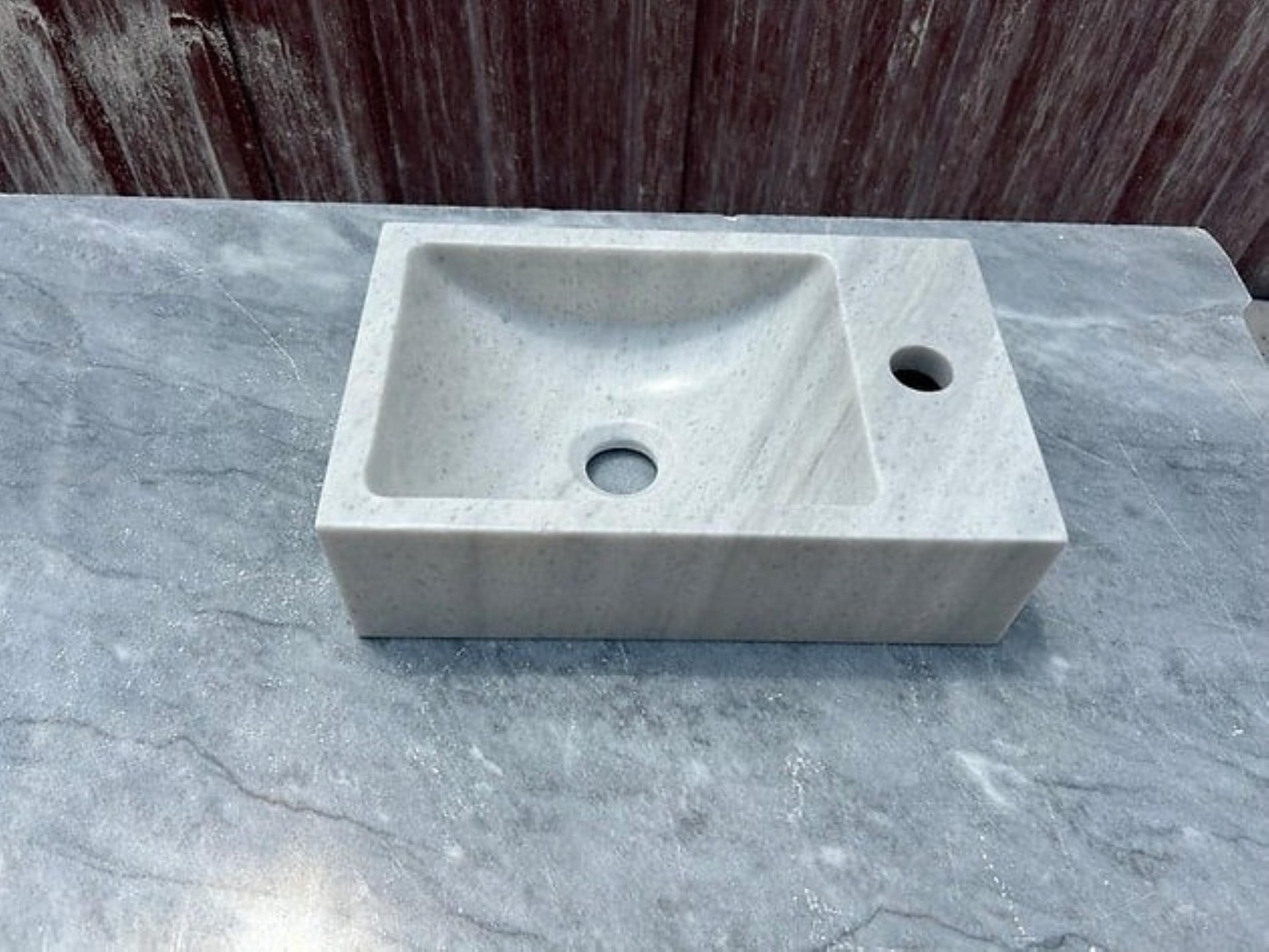 Upgrade your bathroom with this handmade White Marble Countertop Washbasin, designed to combine timeless elegance with modern functionality. Featuring a sleek rectangular shape with a pre-drilled tap hole, this basin offers both style and convenience for luxury bathroom interiors.
