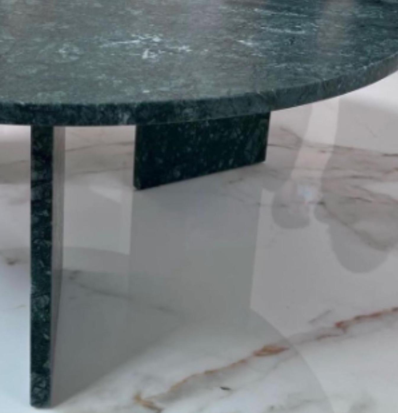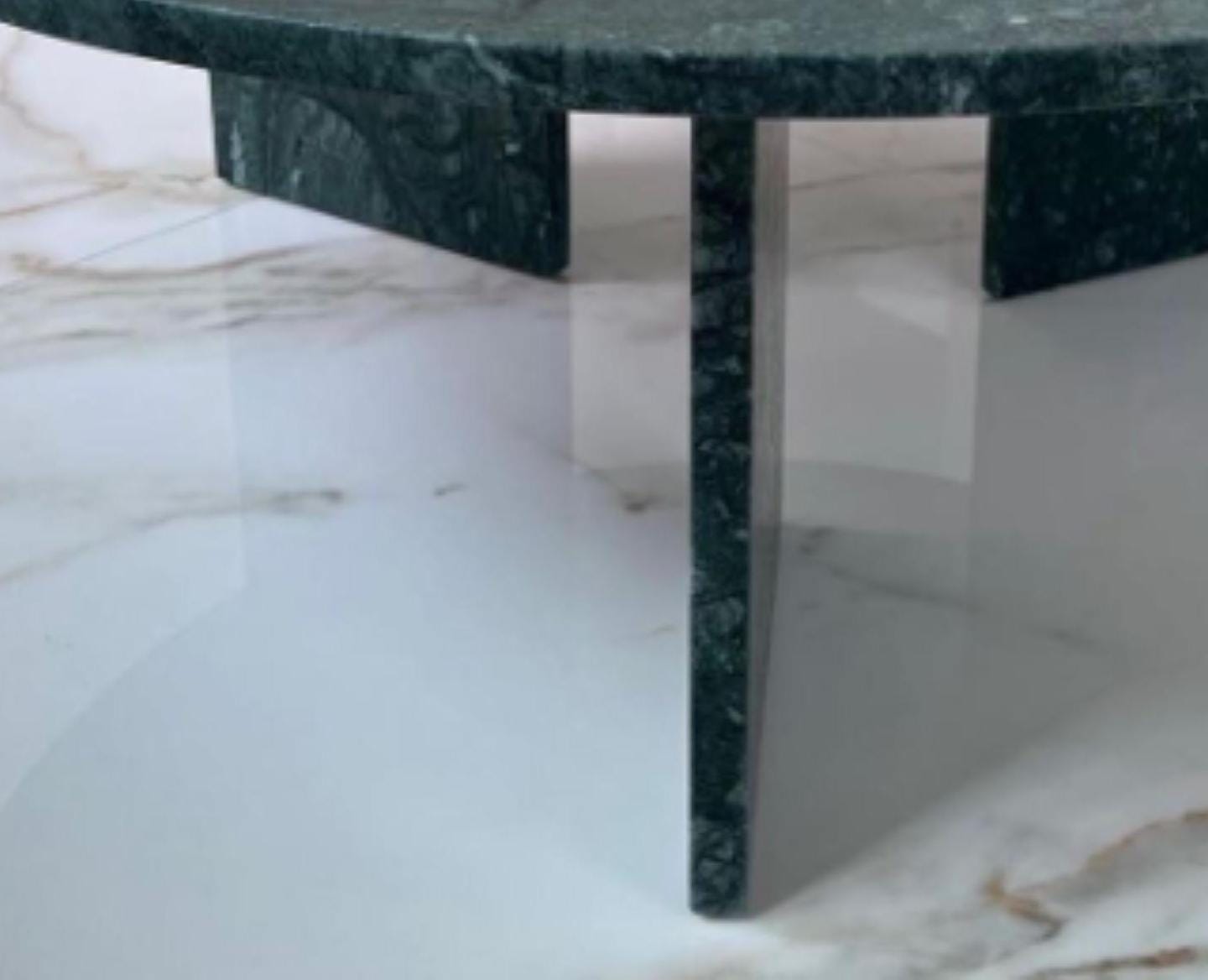 Elevate your interior with this sculptural green marble round coffee table, a striking fusion of contemporary architecture and timeless natural beauty. Meticulously handcrafted, the table features a smooth, circular surface with distinctive veining, supported by a unique geometric base that creates visual intrigue from every angle.