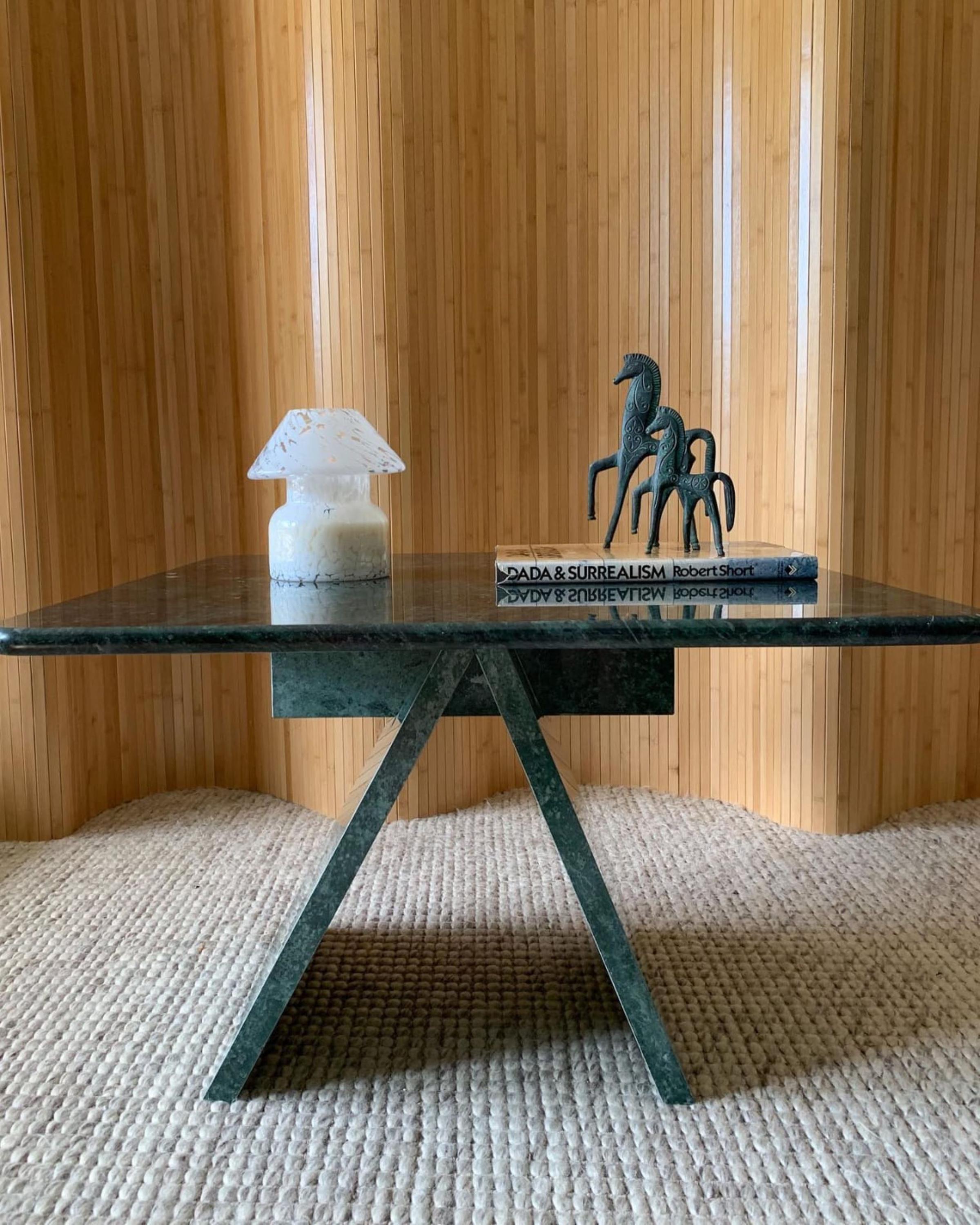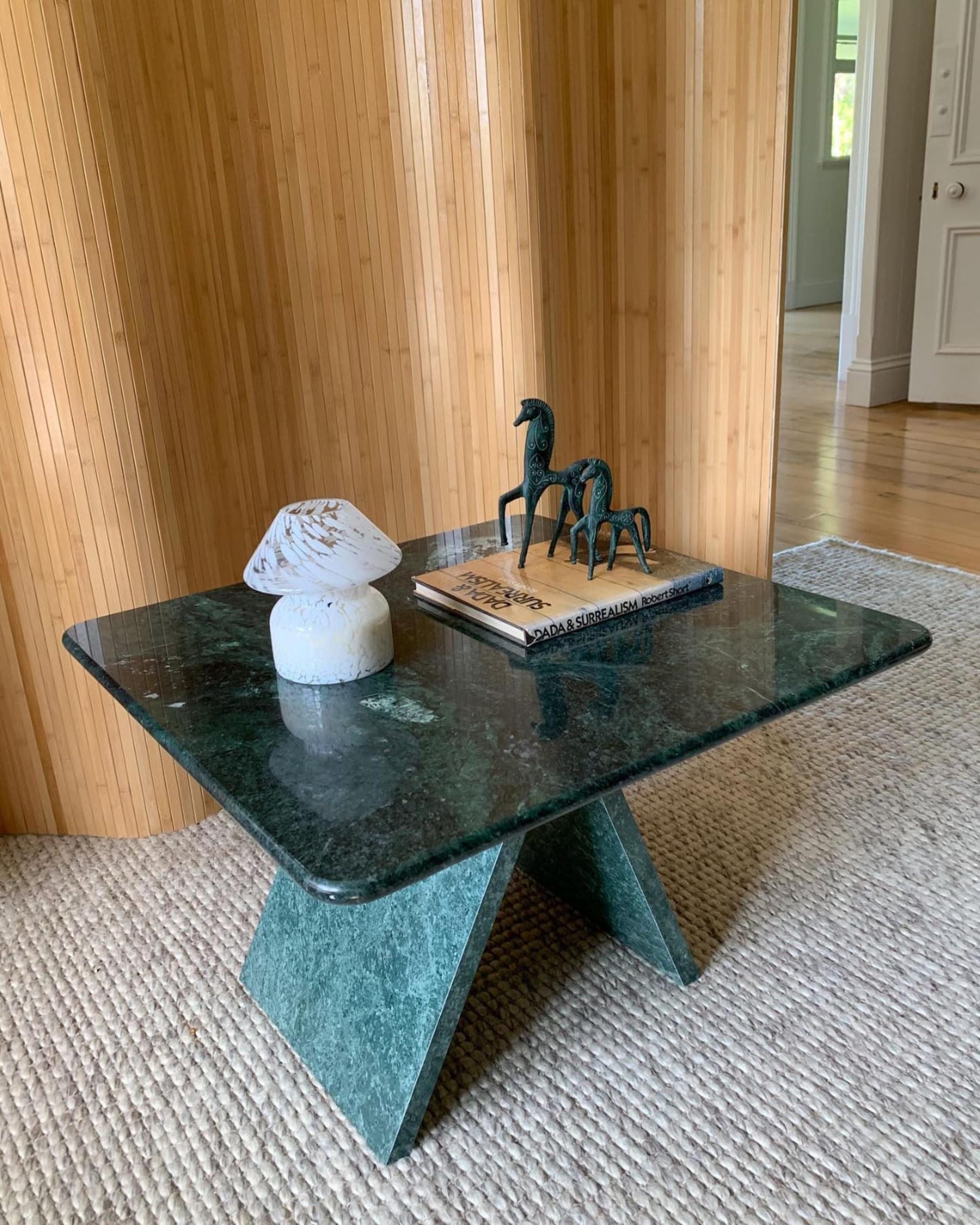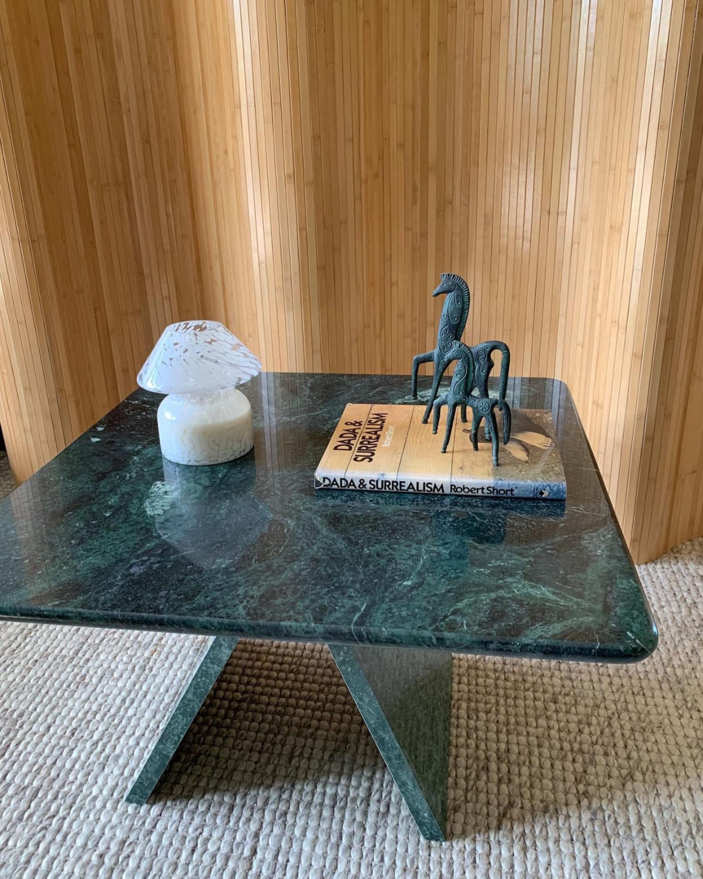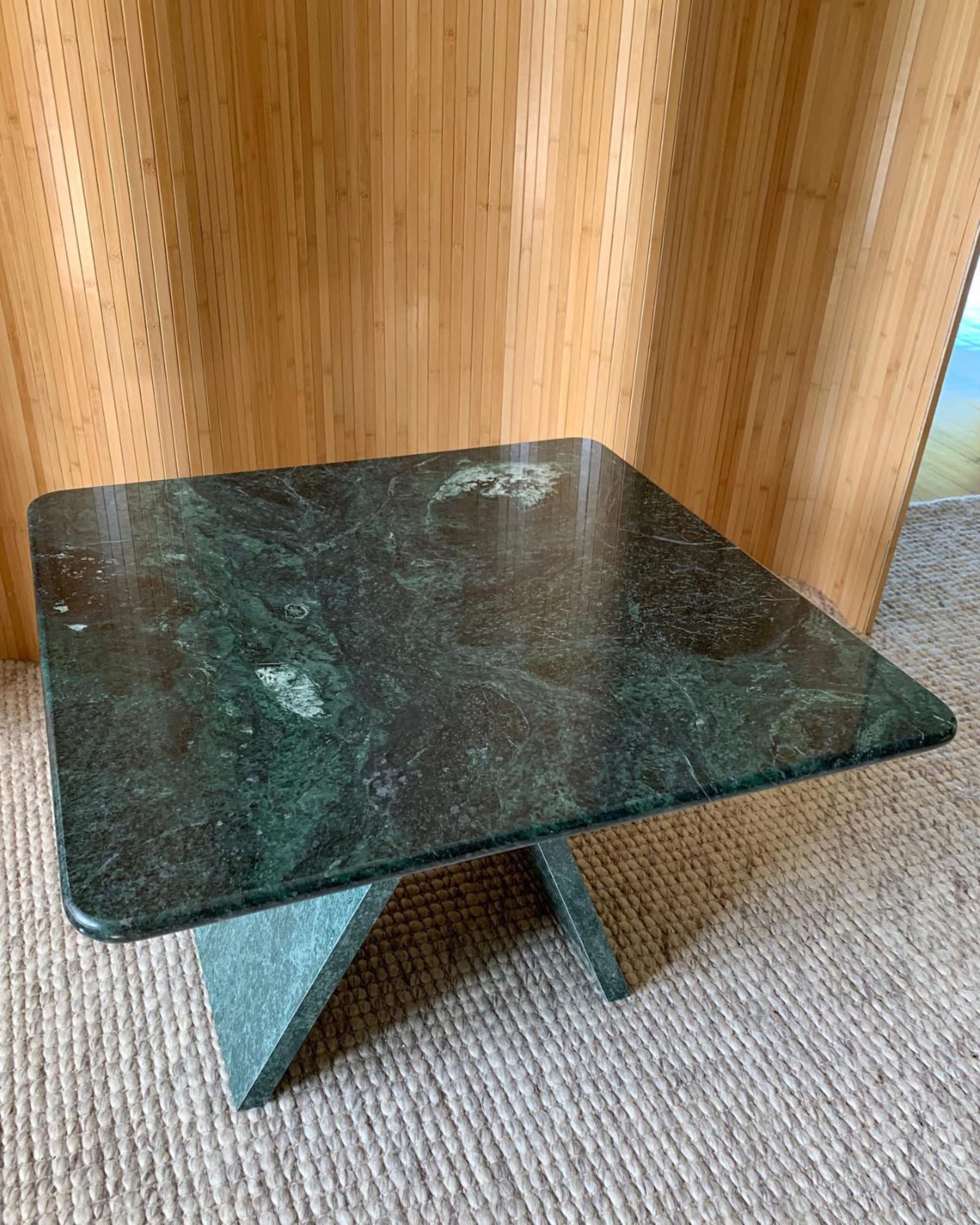 Elevate your interior with this Handmade Green Verde Marble Pedestal Table, crafted from rich emerald-toned marble. Its square top rests on a sculptural intersecting pedestal base, making it a perfect blend of luxury, modern design, and natural stone beauty.