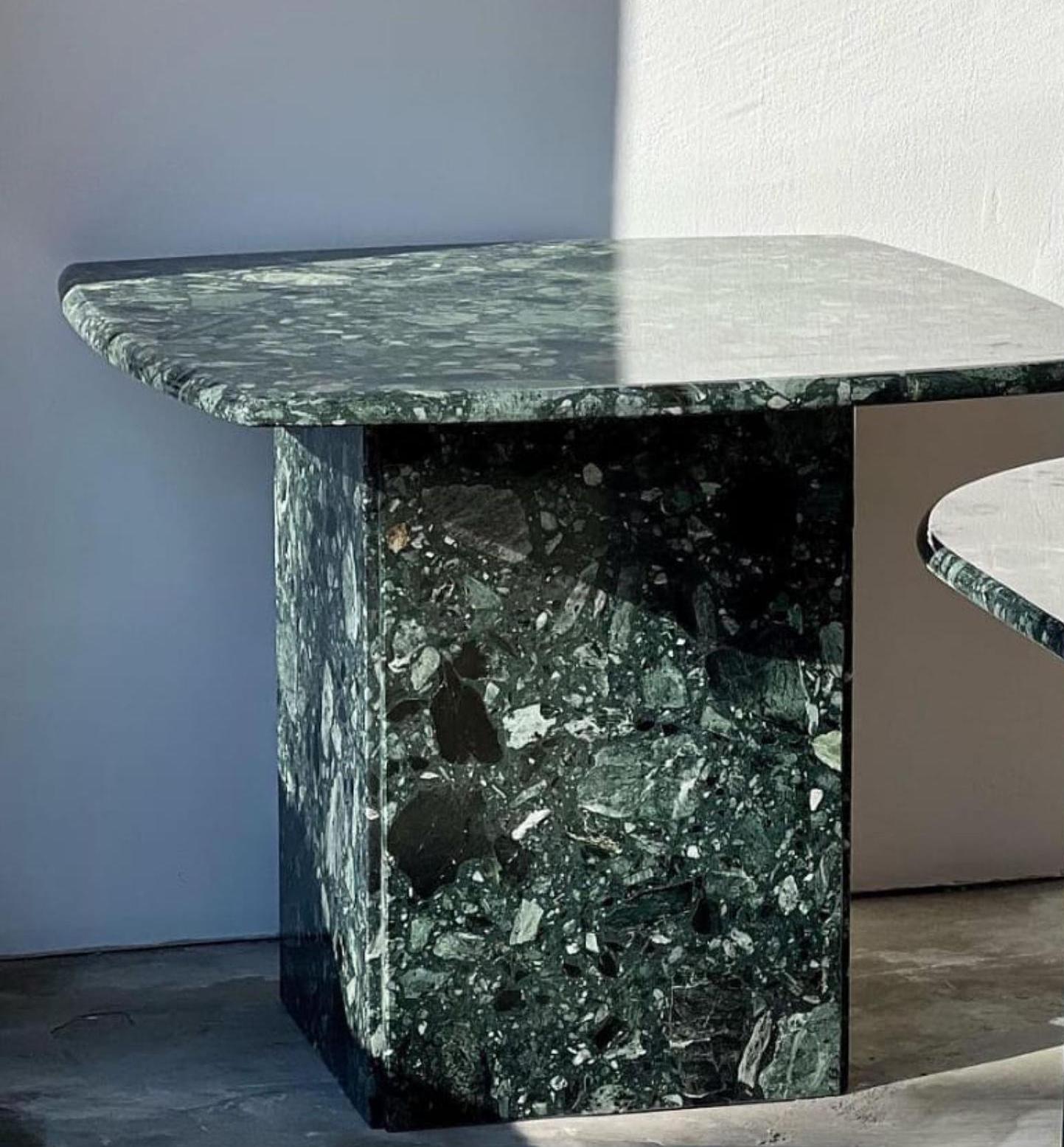 A striking sculptural side table crafted from rich green terrazzo, featuring natural stone fragments that create a one-of-a-kind pattern on every surface. Its bold geometric form and solid construction make it both a functional piece and a statement object.