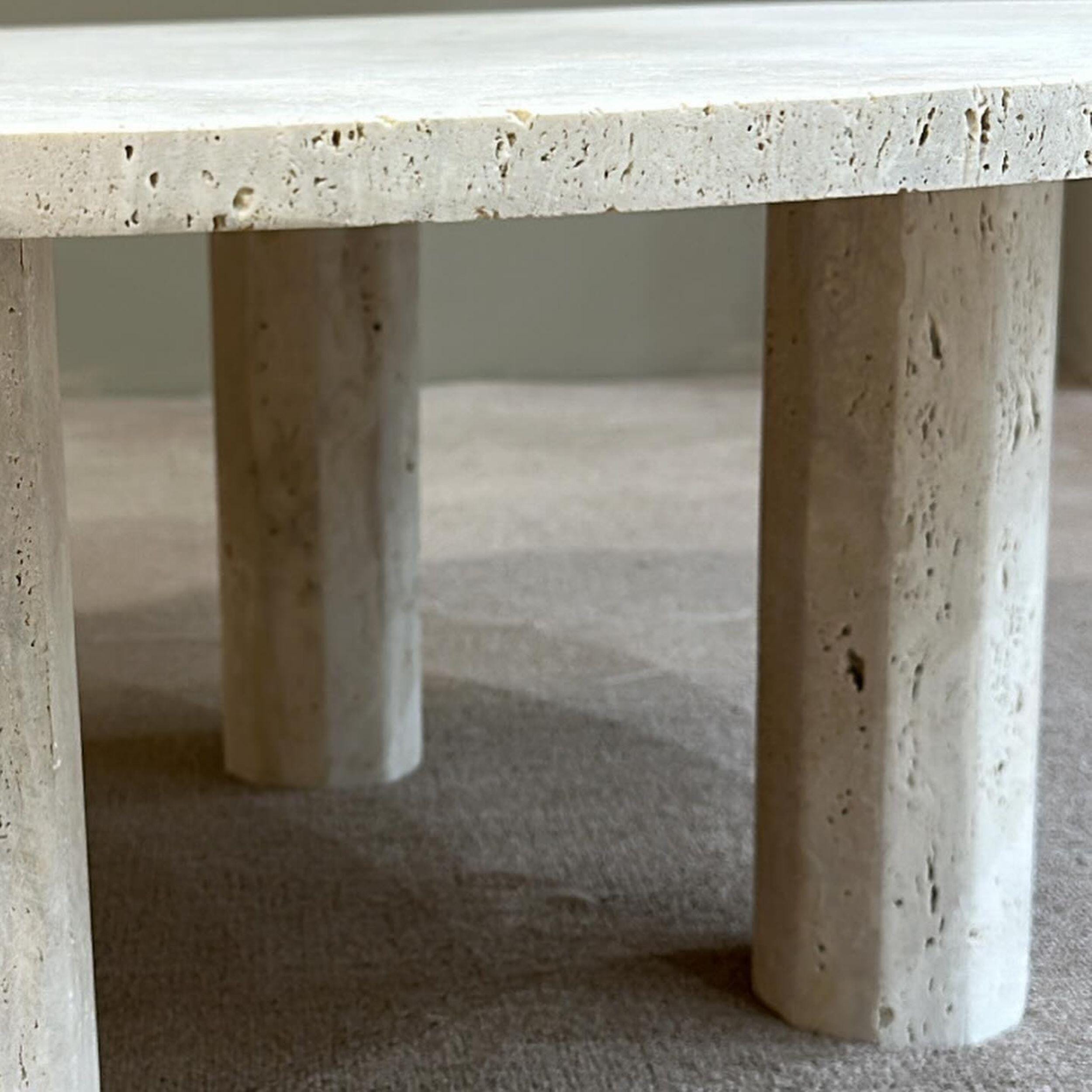 Its sculptural cylindrical legs provide a strong architectural foundation while adding visual balance to the minimalist round top. The polished or honed surface enhances the natural textures of travertine, highlighting its earthy charm and luxurious depth.