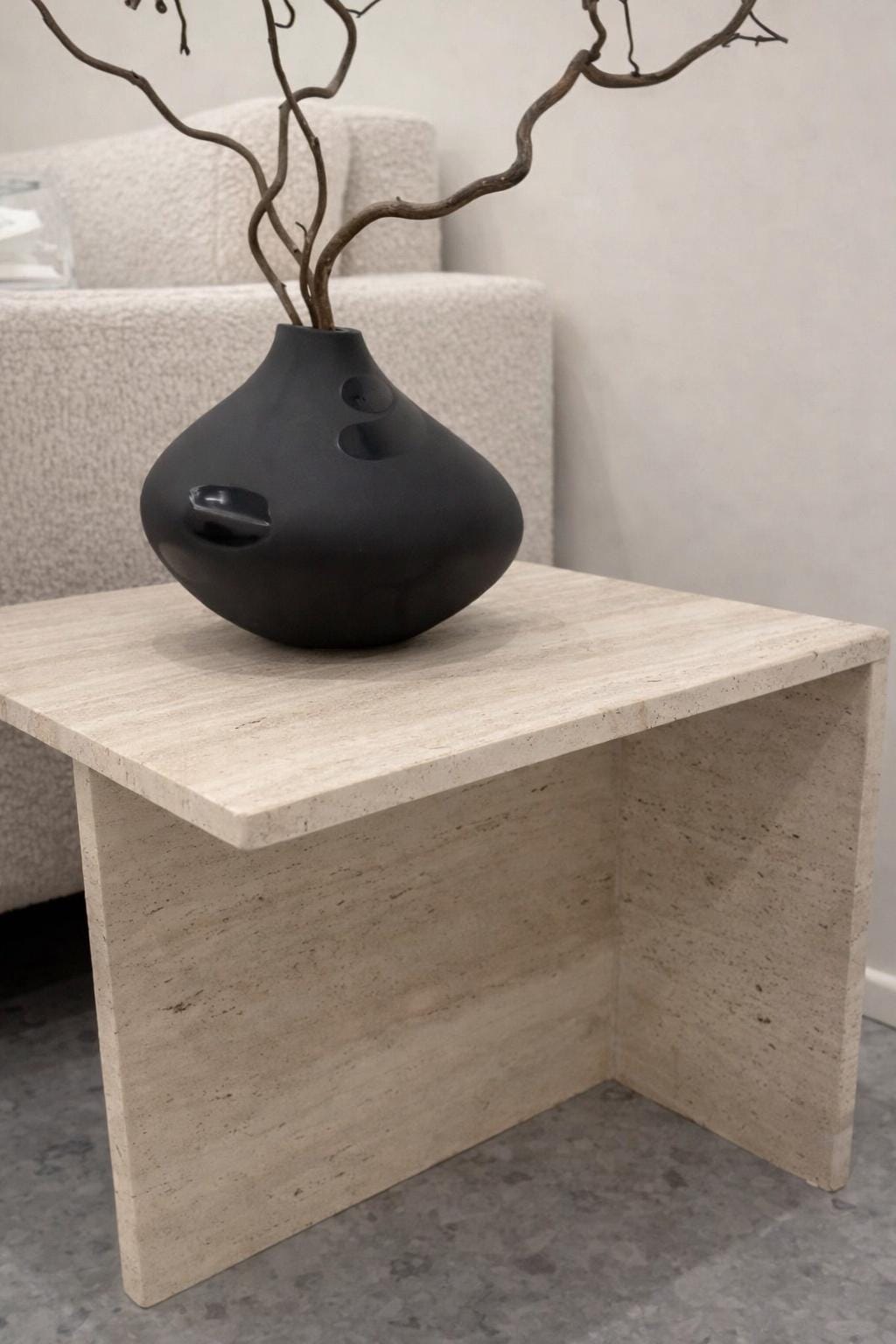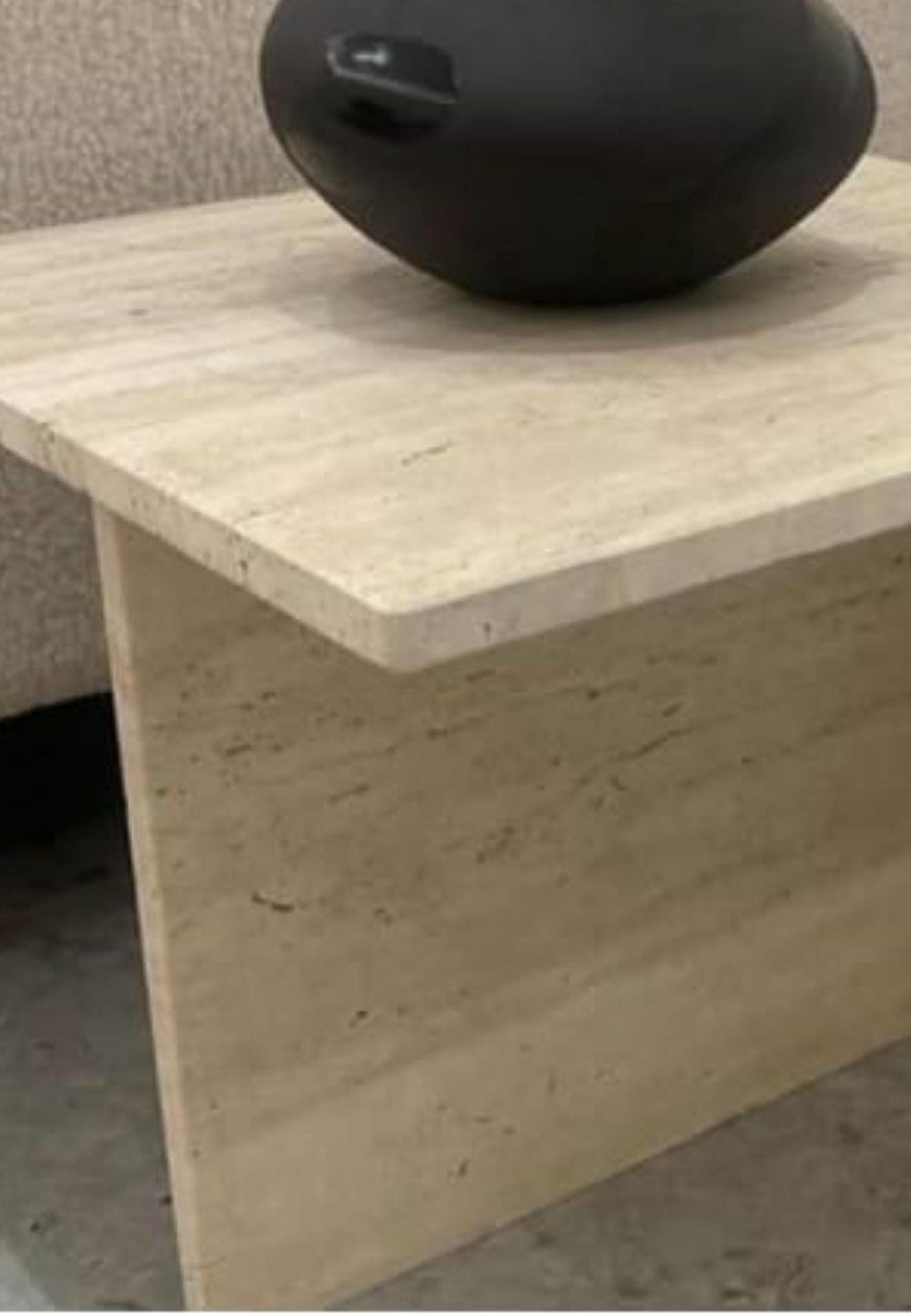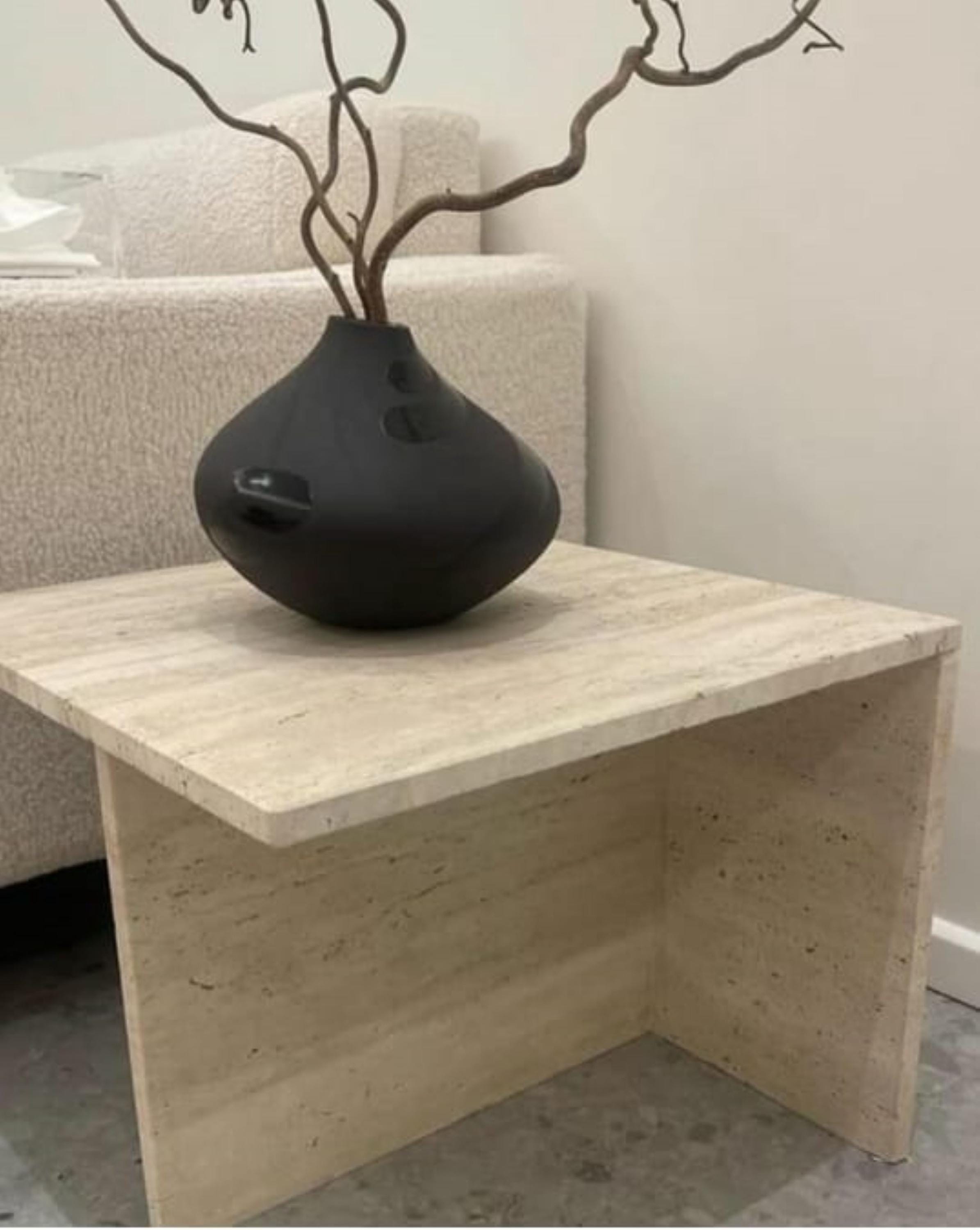 This handcrafted Travertine Side Table showcases a refined minimalist design, perfect for modern interiors. Made from high-quality natural travertine stone, the table features clean lines and a geometric form, bringing a calm, sculptural presence to your living space. Its natural texture and soft beige tones create a serene, earthy ambiance while adding a touch of understated luxury.