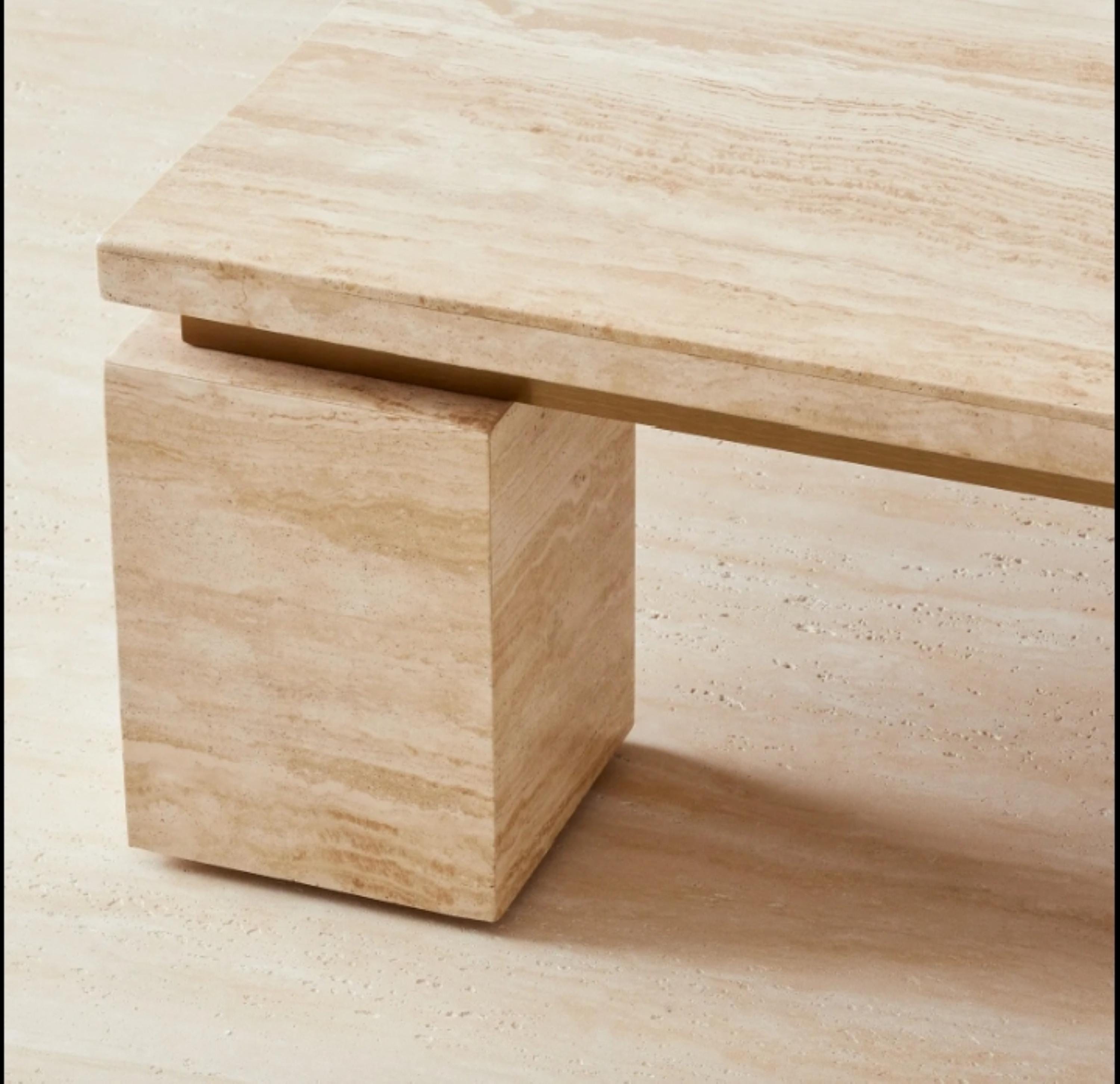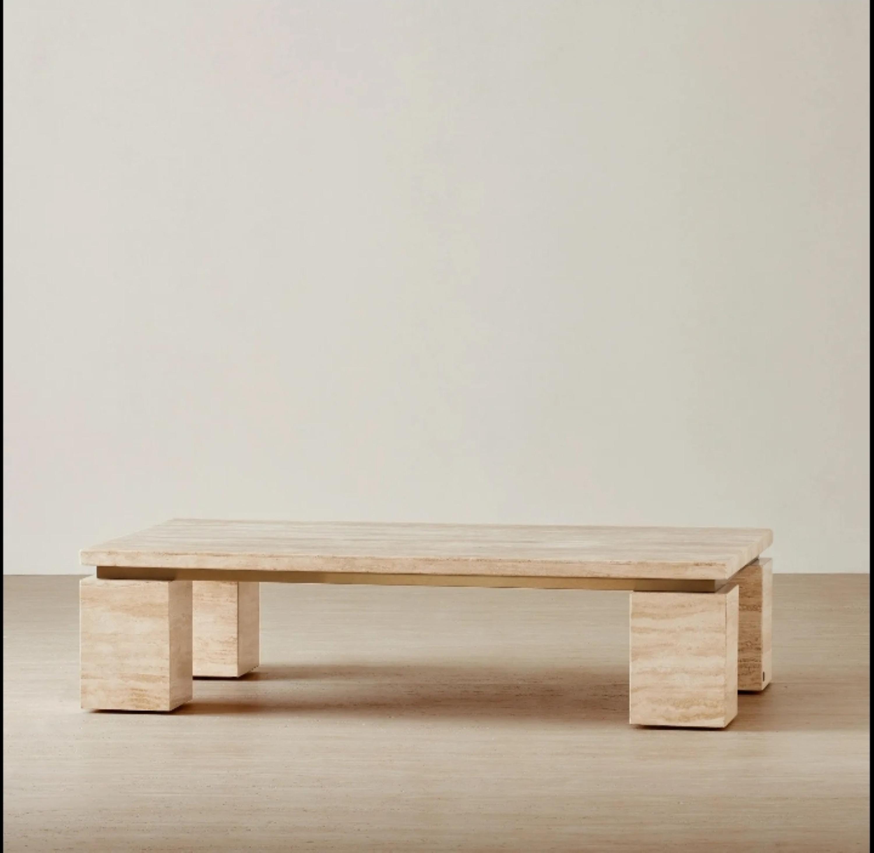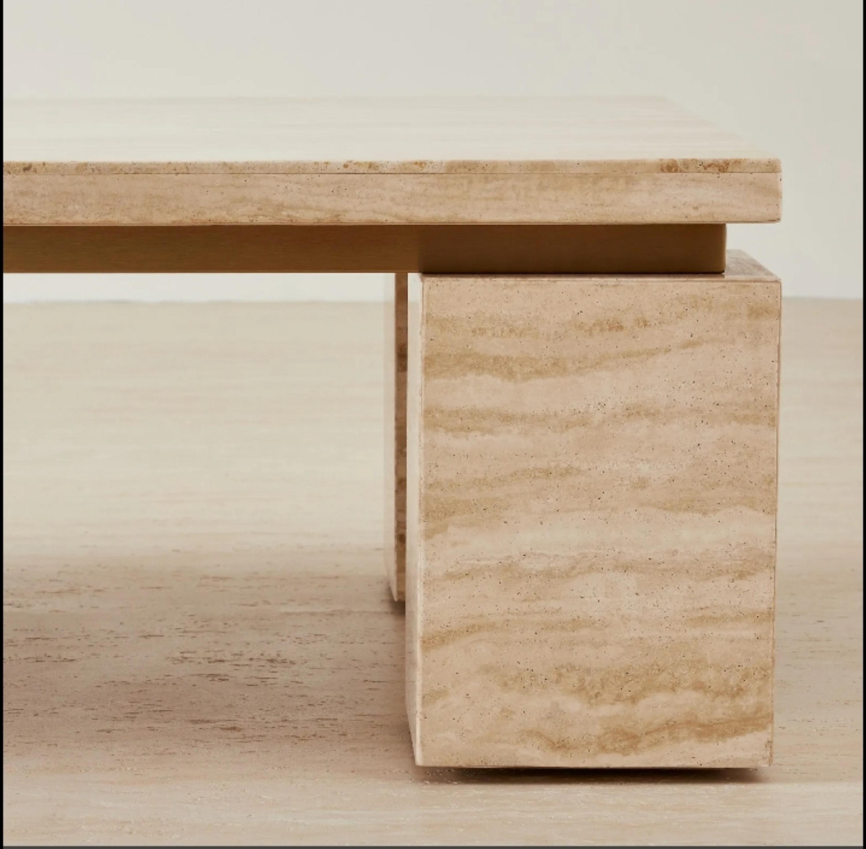 Modern Travertine Stone Coffee Table with Bold Block Legs – Minimalist Luxury Decor