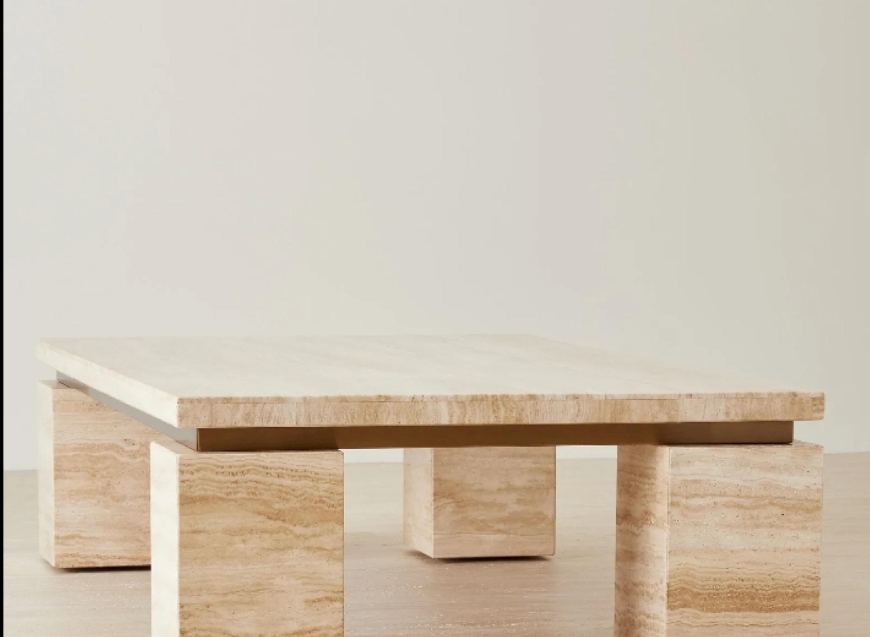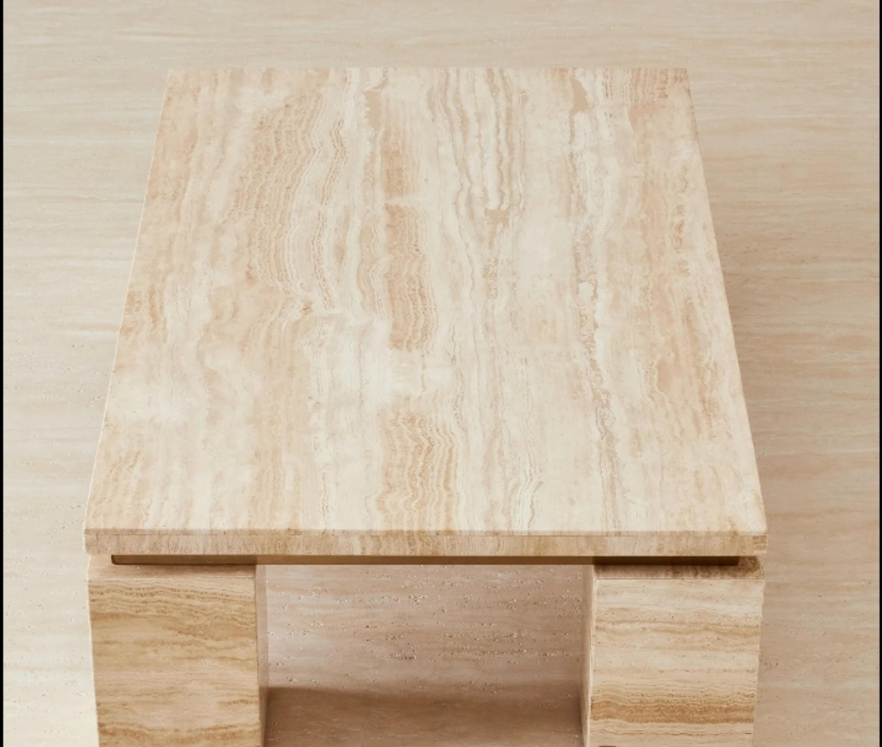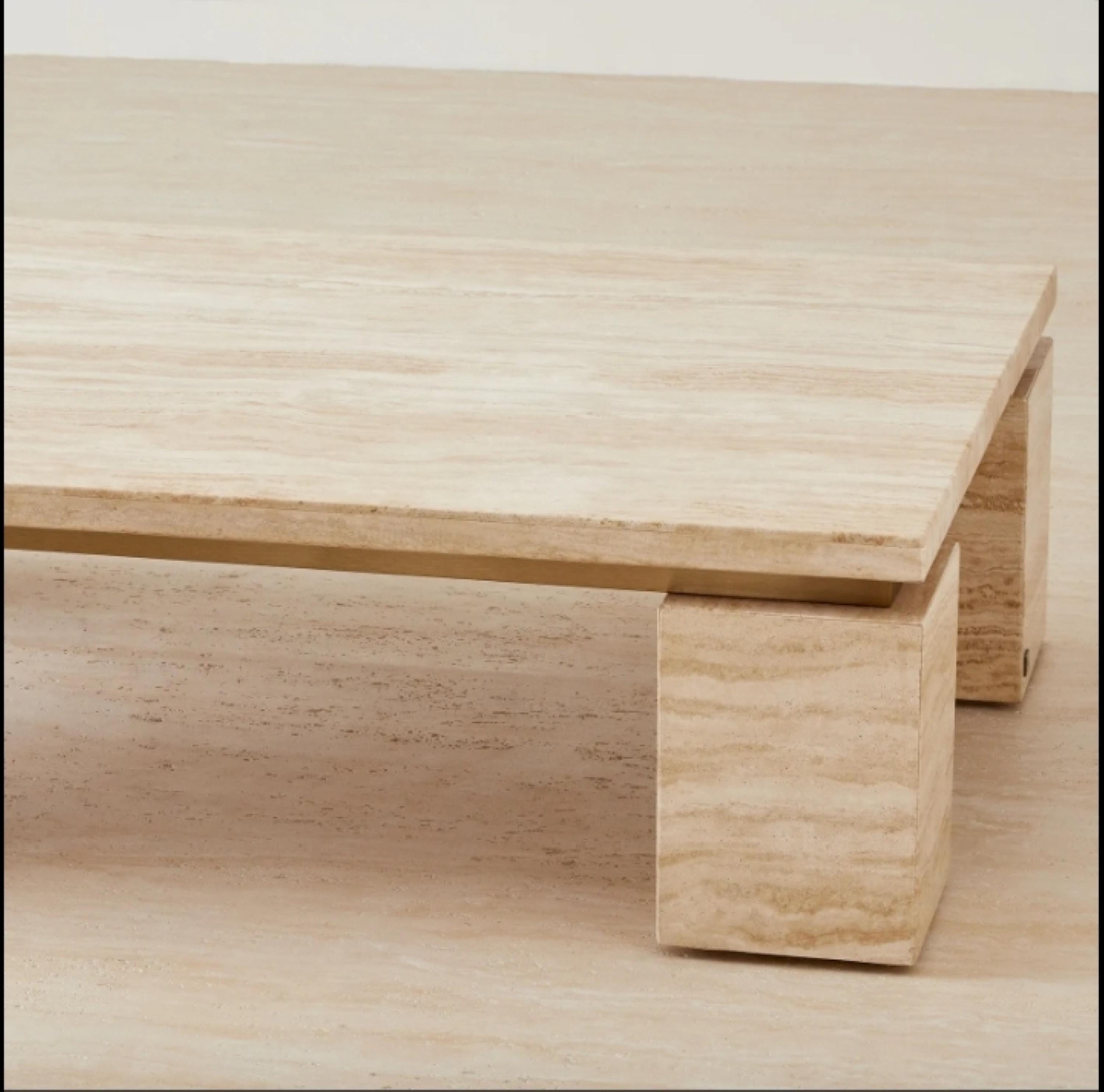 Modern Travertine Stone Coffee Table with Bold Block Legs – Minimalist Luxury Decor