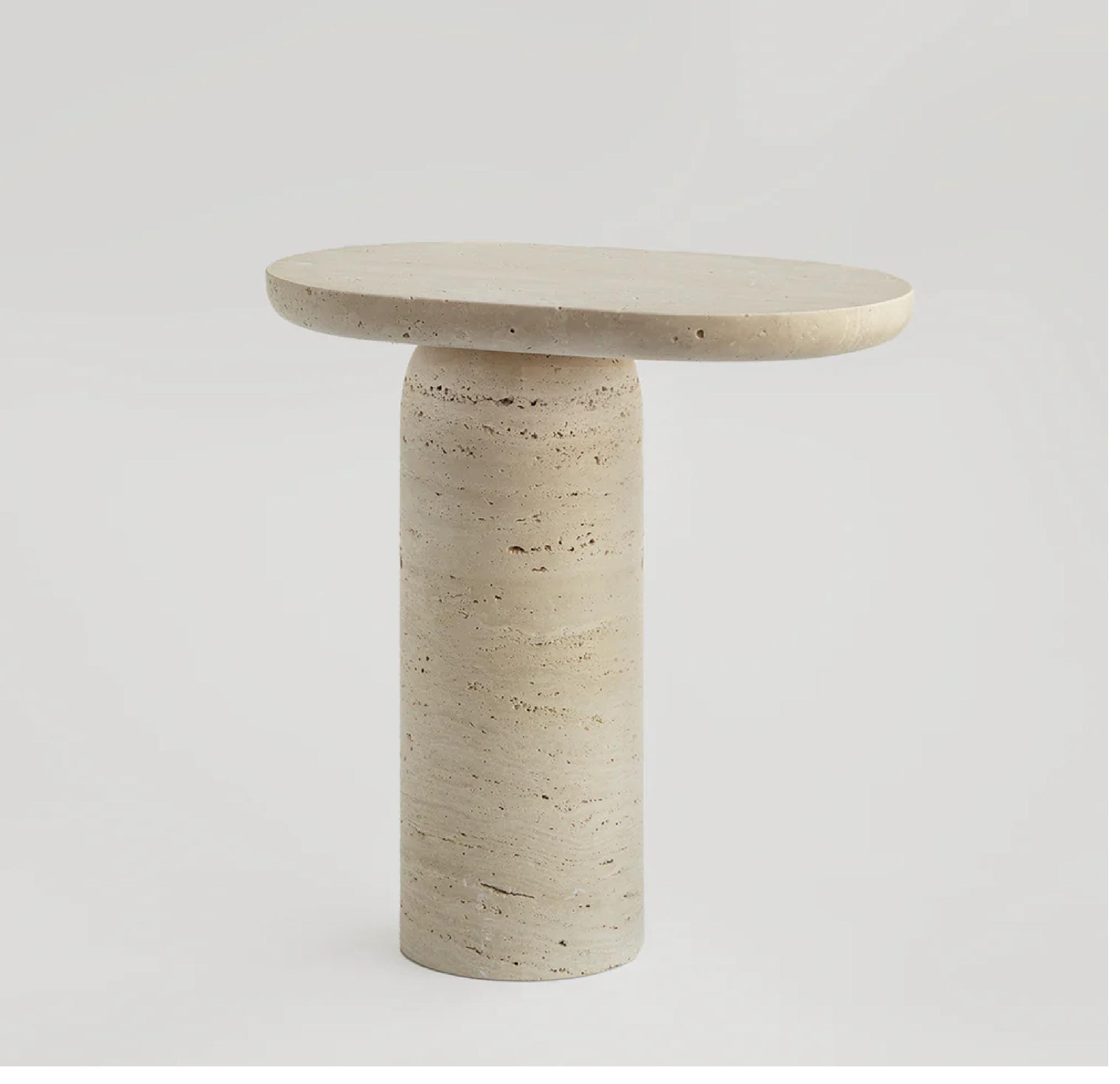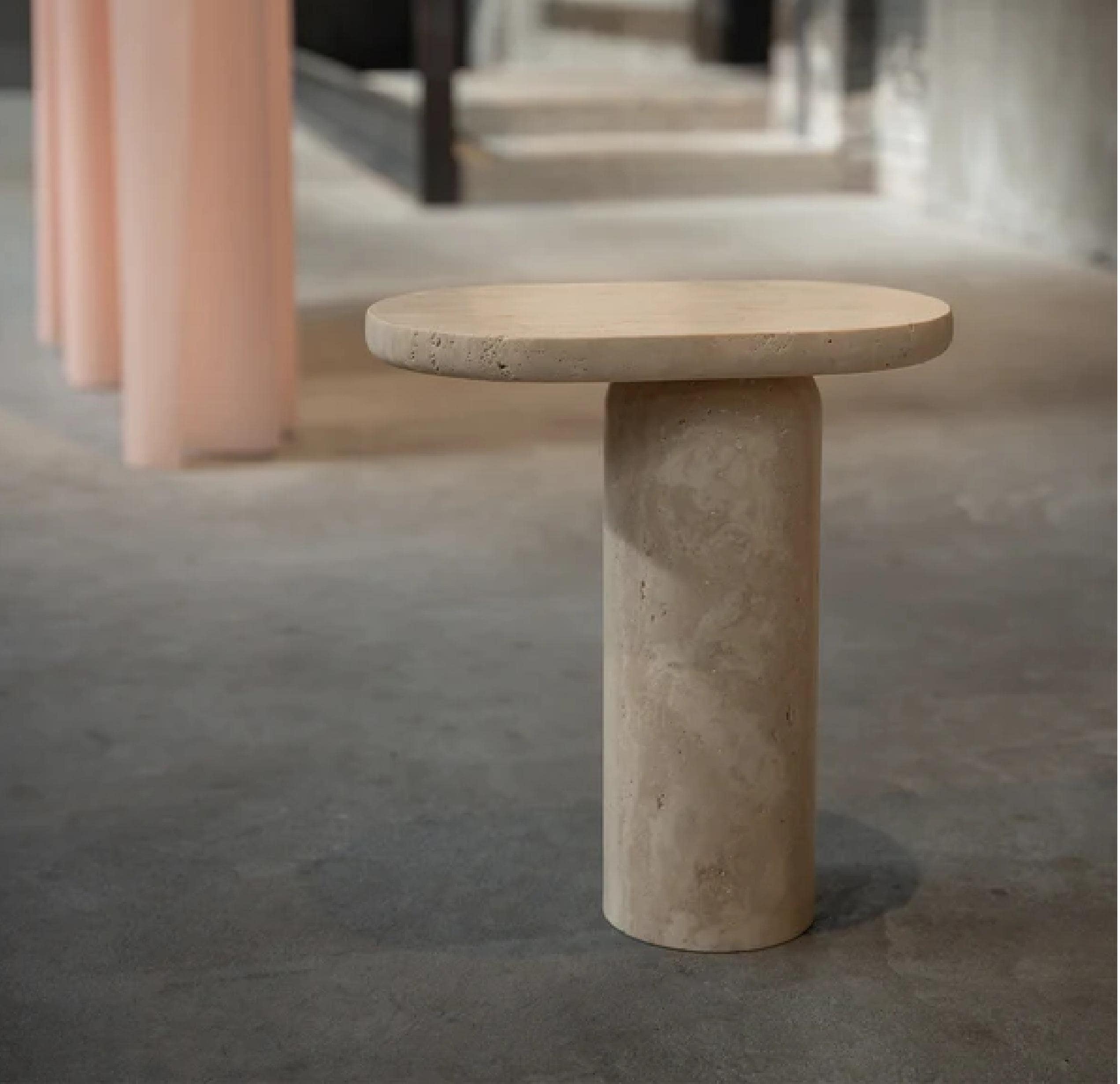 Carved from solid travertine stone, this side table is available in three stunning finishes: