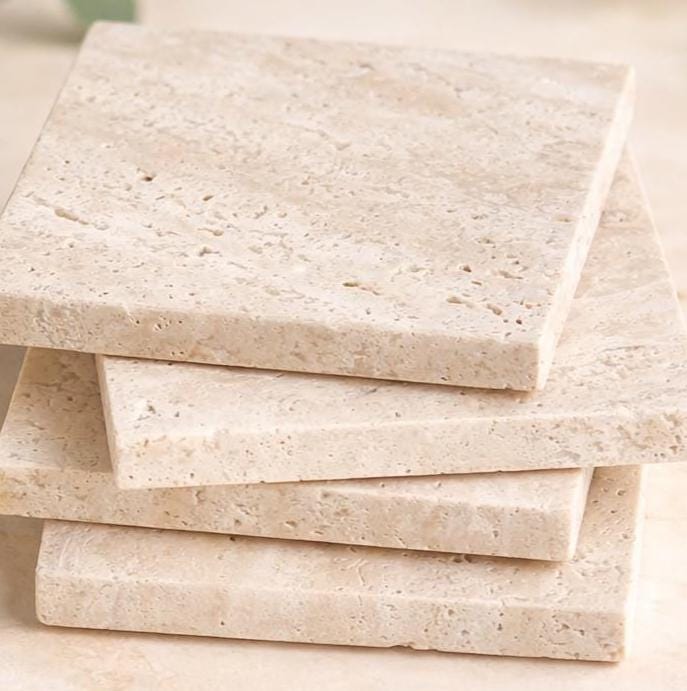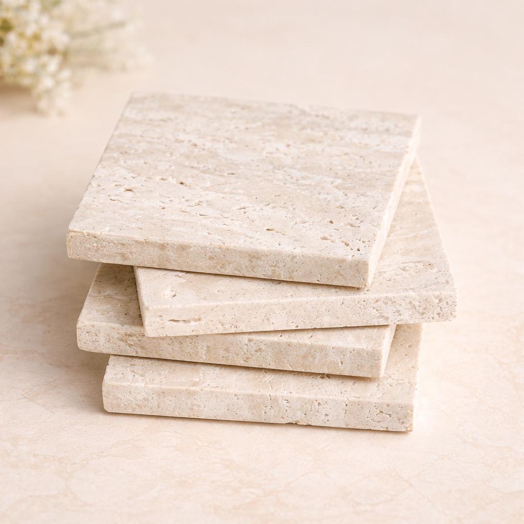 These elegant travertine stone coasters are handcrafted from natural beige travertine, showcasing soft neutral tones and unique natural textures. Each piece features subtle pores and variations that make every coaster one of a kind.