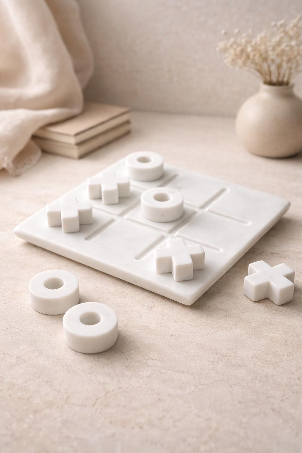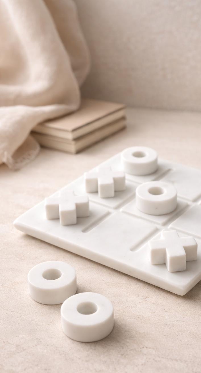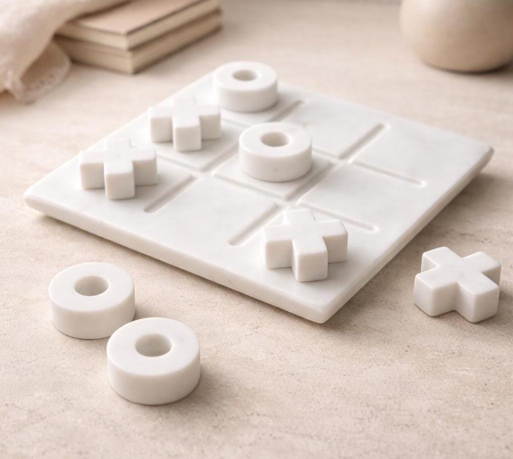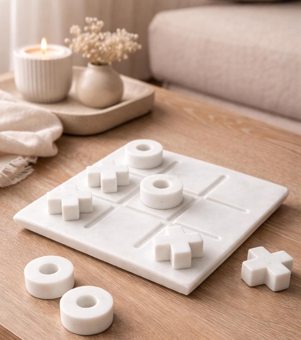 The minimal design includes a marble game board with matching X and O pieces—both modern and classic for all ages.