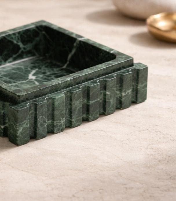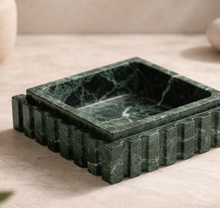 Add timeless elegance to your space with this handcrafted green marble square tray, designed to elevate both modern and classic interiors. Carefully carved from natural marble, each piece showcases unique white veining, making every tray truly one of a kind.