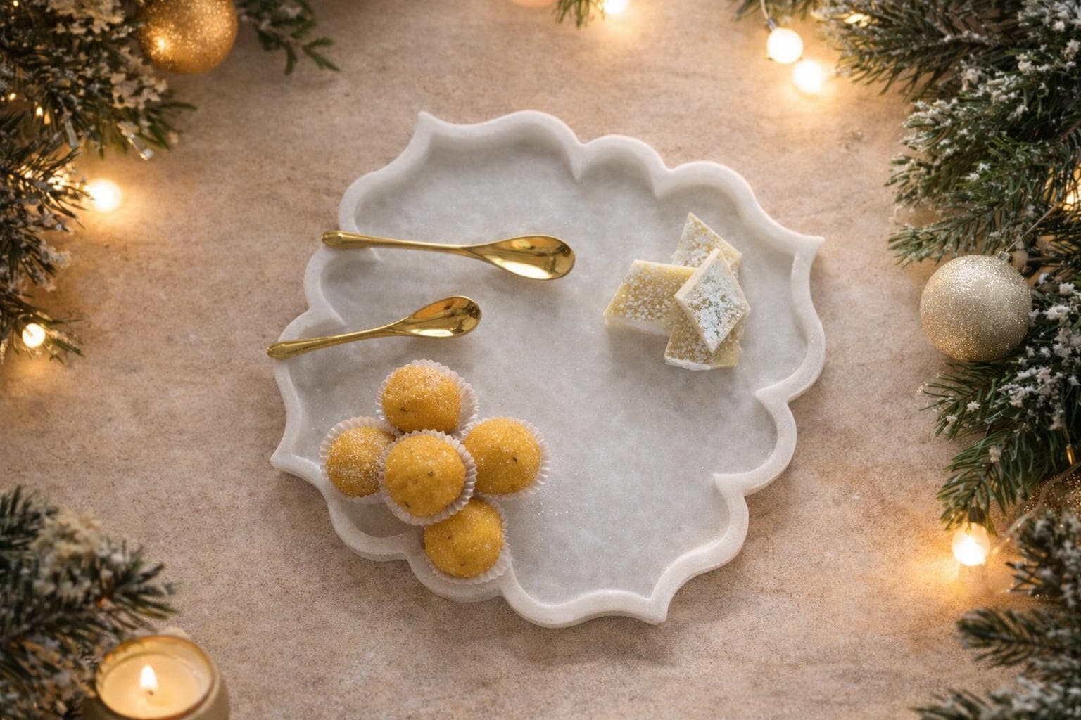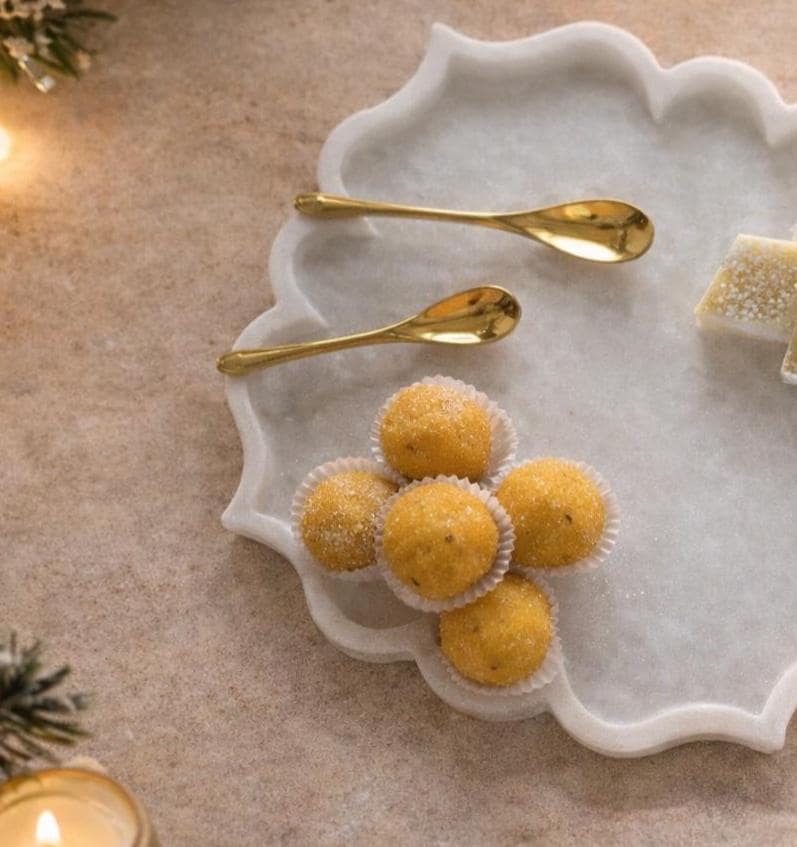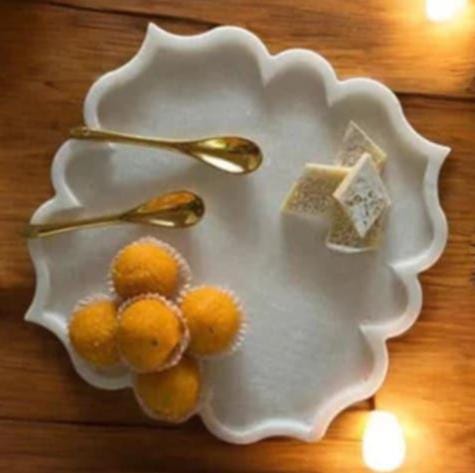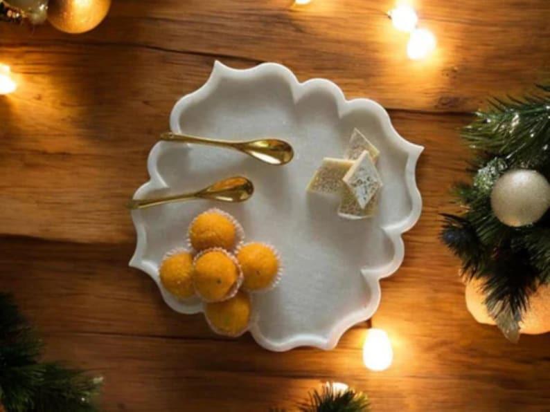 Add a touch of festive charm and luxury to your table with this Scalloped White Marble Serving Plate. Handcrafted from premium natural marble, this plate features an elegant wavy edge that beautifully frames your treats, desserts, or appetizers. The smooth surface and soft white tone highlight the natural veins of the marble, making it both functional and decorative.