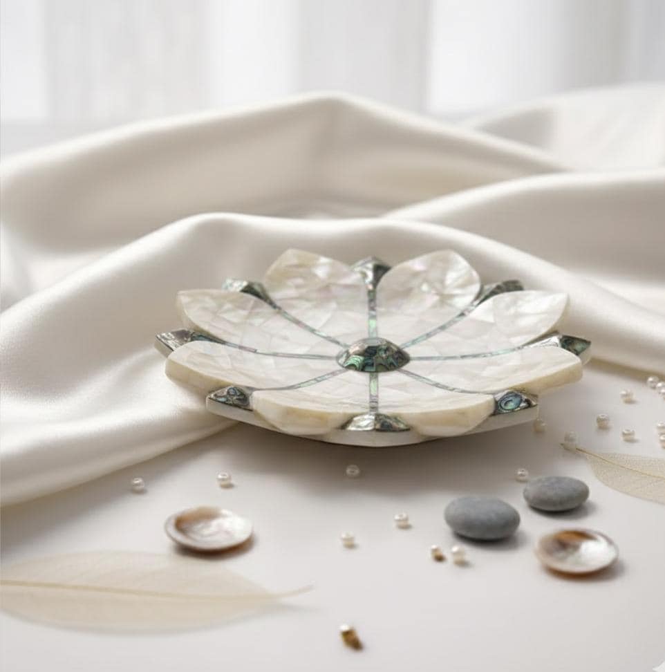 Bring the regal charm of Indian heritage to your home with this exquisite handcrafted white marble bowl. Featuring a stunning Lotus design, this piece is meticulously adorned with shimmering Mother of Pearl and colorful Abalone shell inlay. It is a perfect fusion of luxury, tradition, and modern minimalist aesthetics.
