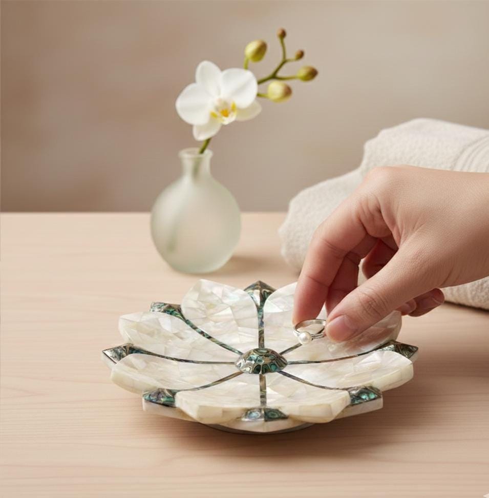 Q: How do I clean the Mother of Pearl inlay? A: Simply use a soft microfiber cloth. Avoid harsh chemicals or abrasive scrubbers, as natural shells and marble are delicate.