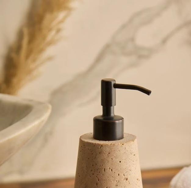 Add a touch of natural elegance to your bathroom or kitchen with this Beige Travertine Soap Dispenser, beautifully crafted from real travertine stone. The warm beige tones and organic textures make each piece completely one-of-a-kind, showcasing the timeless beauty of natural stone.