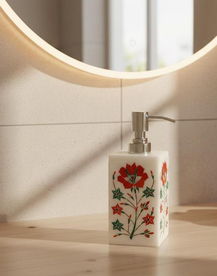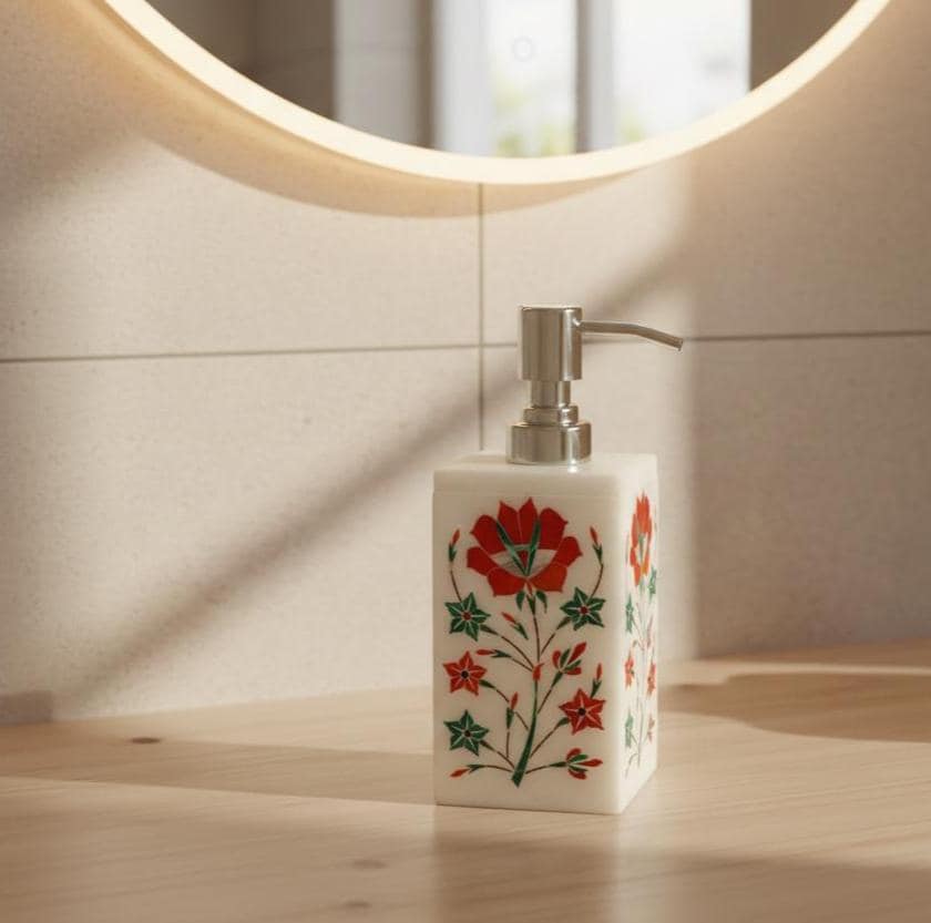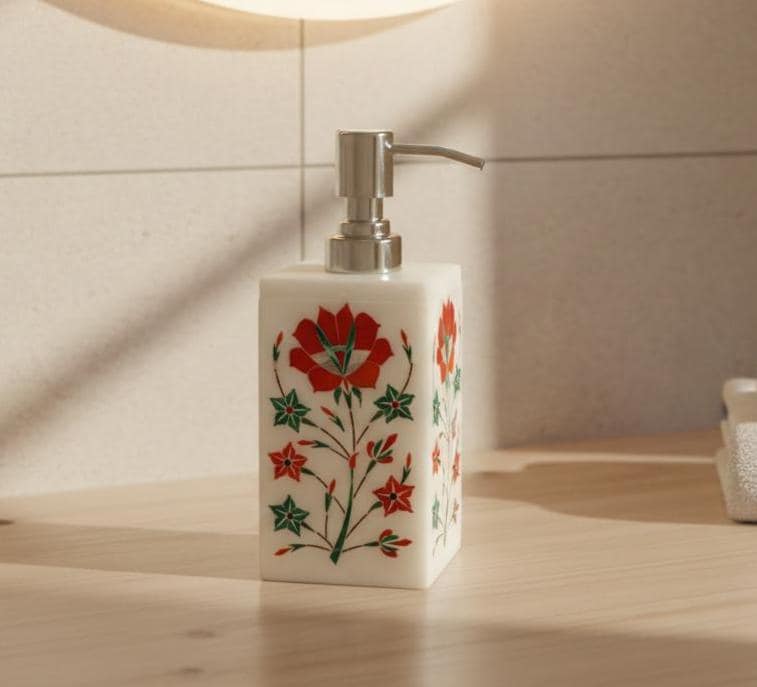 The crisp white marble base contrasts perfectly with the red and green floral inlay, while the polished metal pump adds a modern and functional touch. Both decorative and practical, this dispenser brings timeless charm and artisanal luxury to everyday spaces.