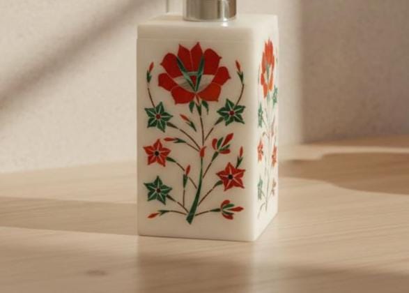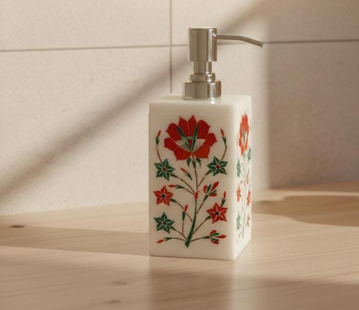 Handcrafted Marble Soap Dispenser with Floral Inlay | Square Marble Bathroom Accessory