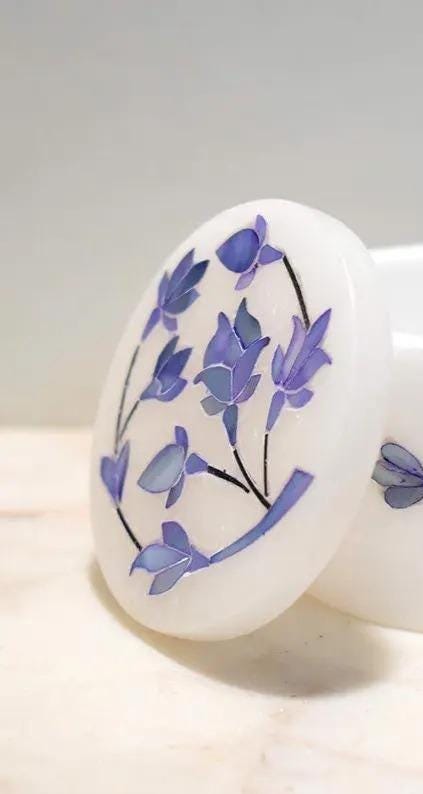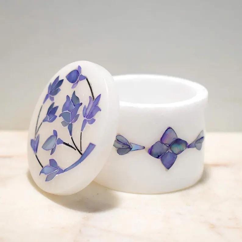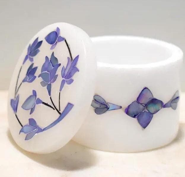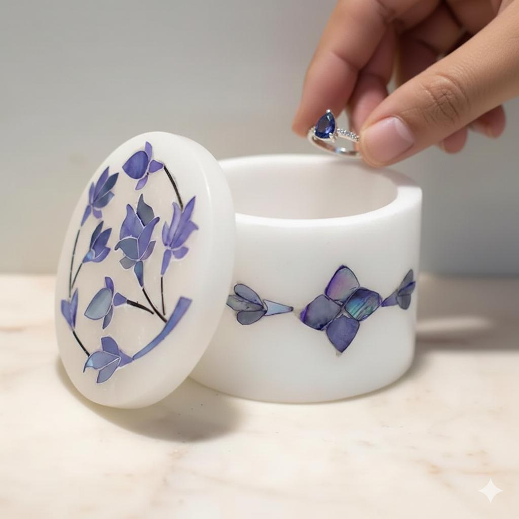This elegant jewelry box is a celebration of the legendary Pietra Dura technique, meticulously handcrafted by artisans in Agra. Featuring a delicate blue floral pattern, each petal is hand-cut from vibrant semi-precious stones and seamlessly inlaid into a solid block of high-quality white marble.