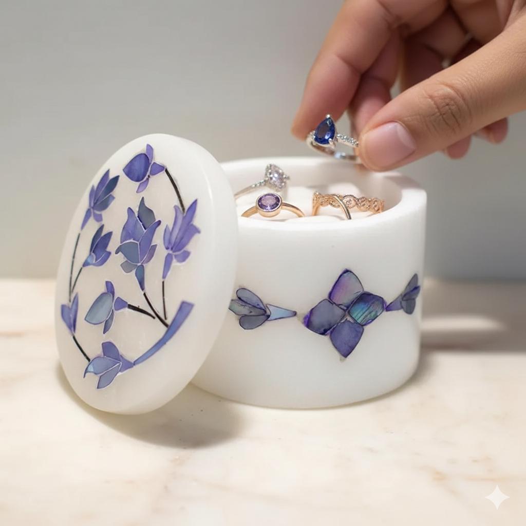 The circular design and smooth, polished finish make it an ideal sanctuary for an engagement ring, wedding band, or a cherished heirloom. It is not just a storage box; it is a piece of MarblingOver art that brings the royal heritage of India into your daily life.