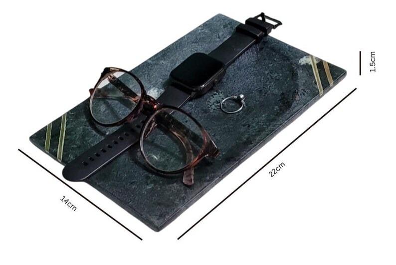 Elevate your space with this handmade green marble tray, crafted from natural stone with elegant brass inlay detailing. Its sleek rectangular design makes it perfect for organizing daily essentials while adding a touch of luxury to your home.
