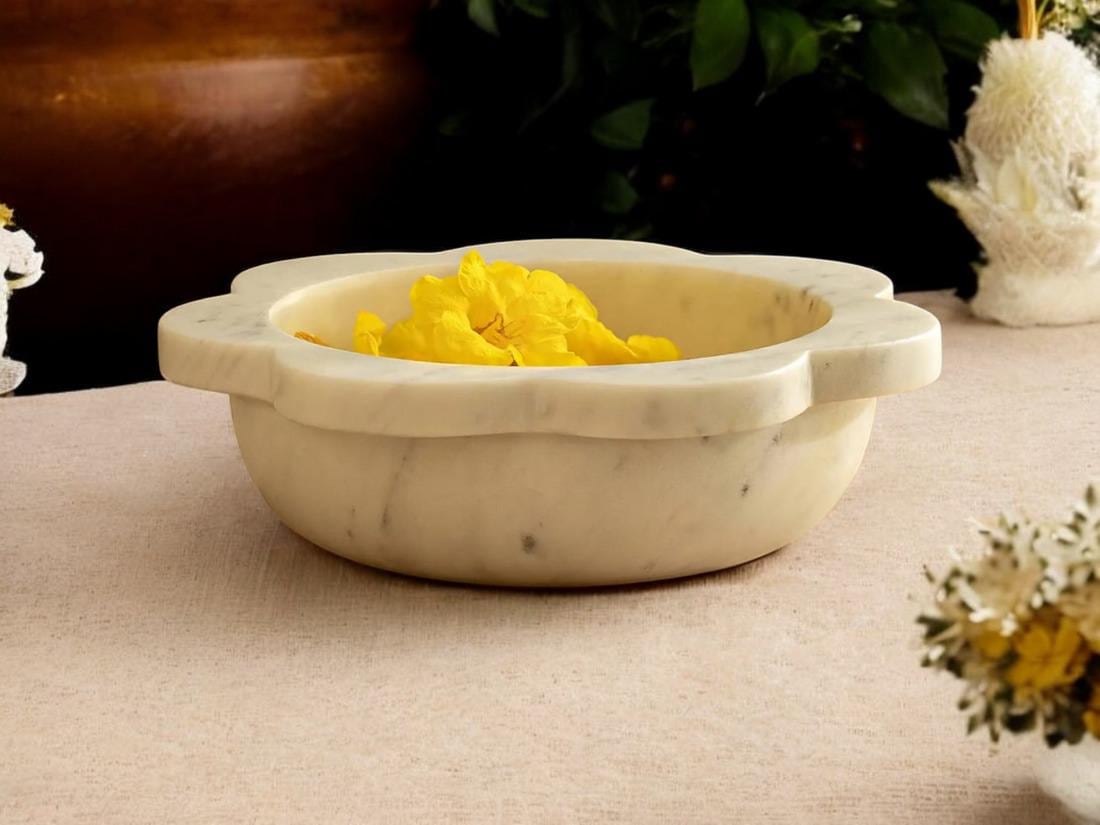 Enhance your home with timeless elegance using this Handcrafted White Marble Flower Urli Bowl, beautifully carved from natural marble. Traditionally used for floating flowers and candles, this urli brings a serene and festive charm to any space.