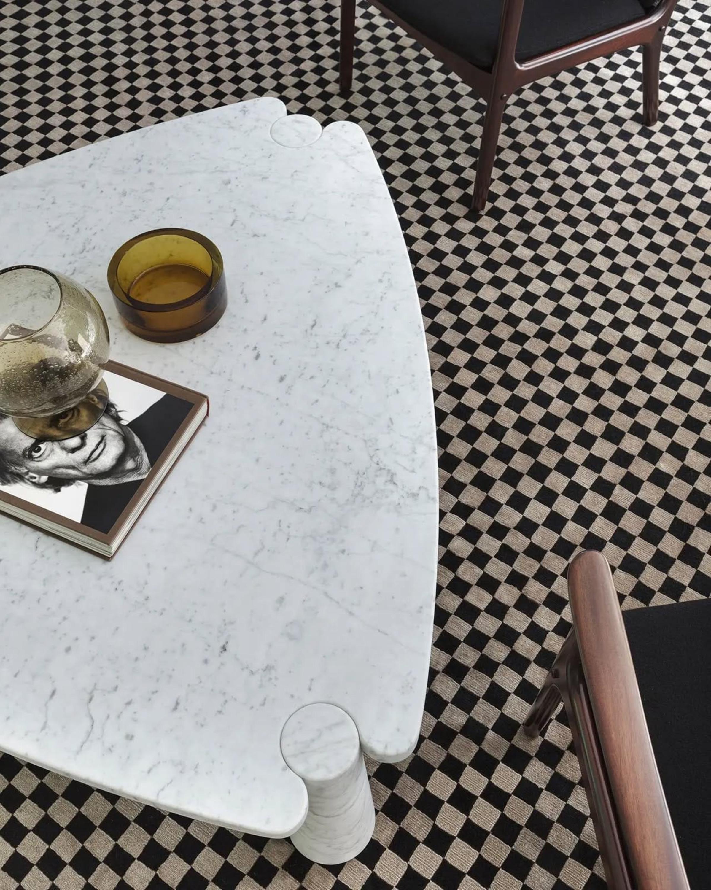 The table features a triangular top with softly rounded corners, resting on three cylindrical marble legs. Its seamless sculptural form highlights the natural veining of Carrara marble, making it not just a piece of furniture, but a functional work of art.