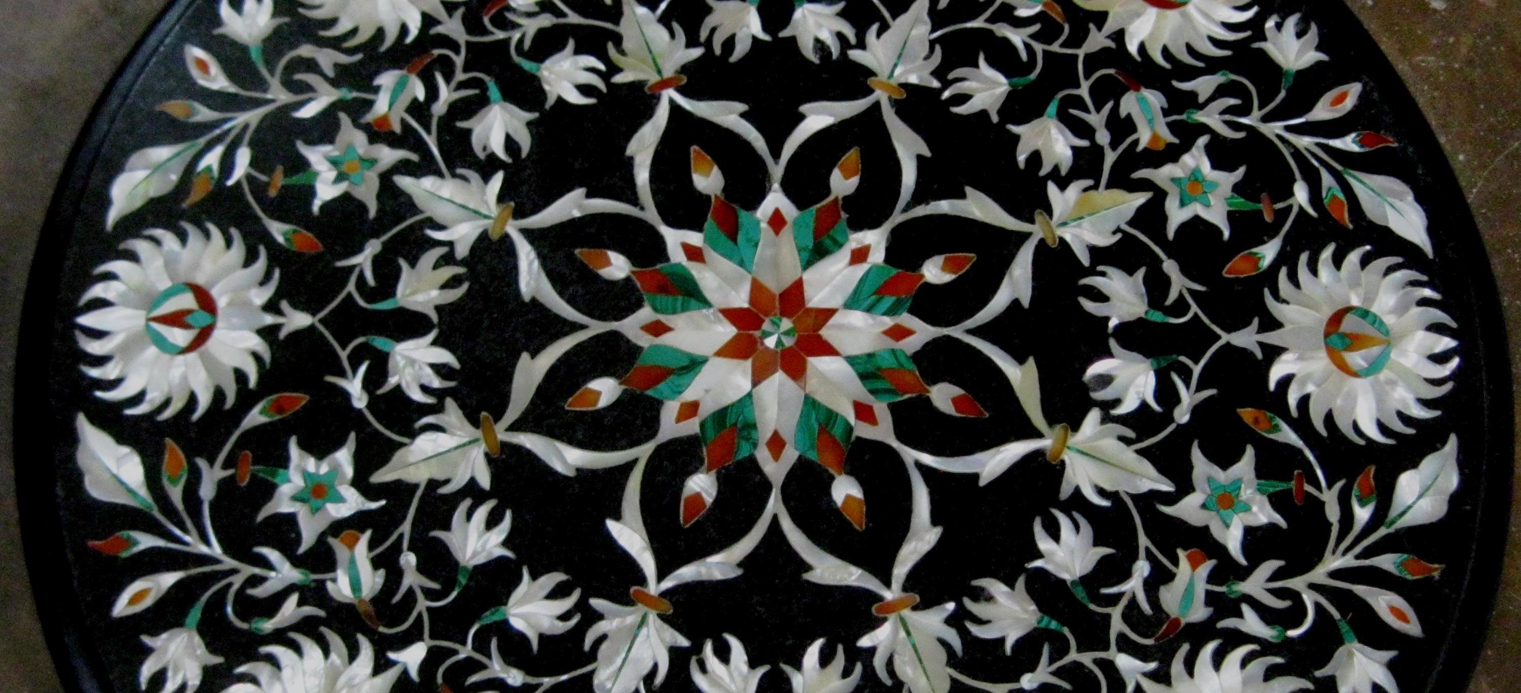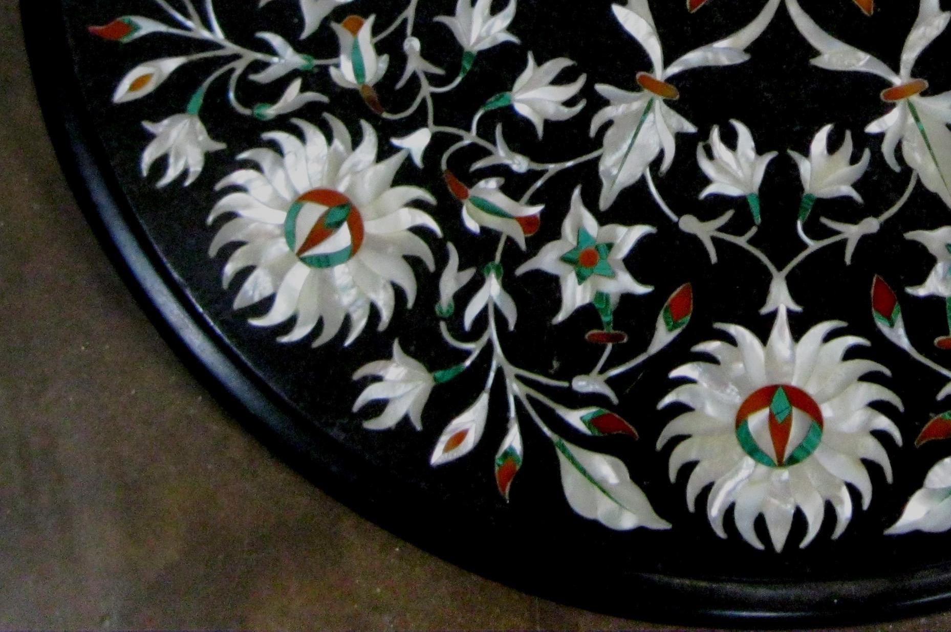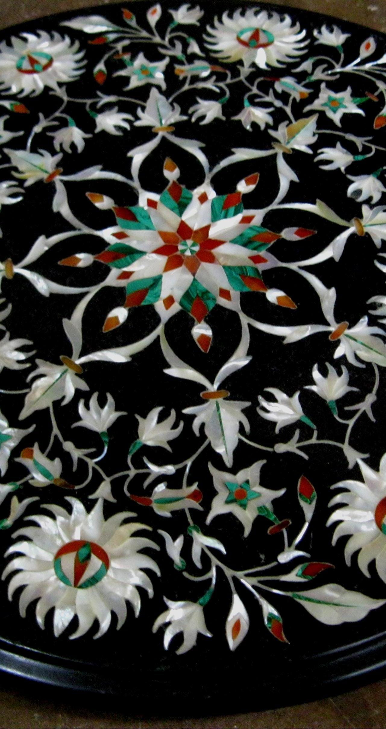 Round Black Marble Floral Inlay Table Top | Handmade Pietra Dura Stone Art