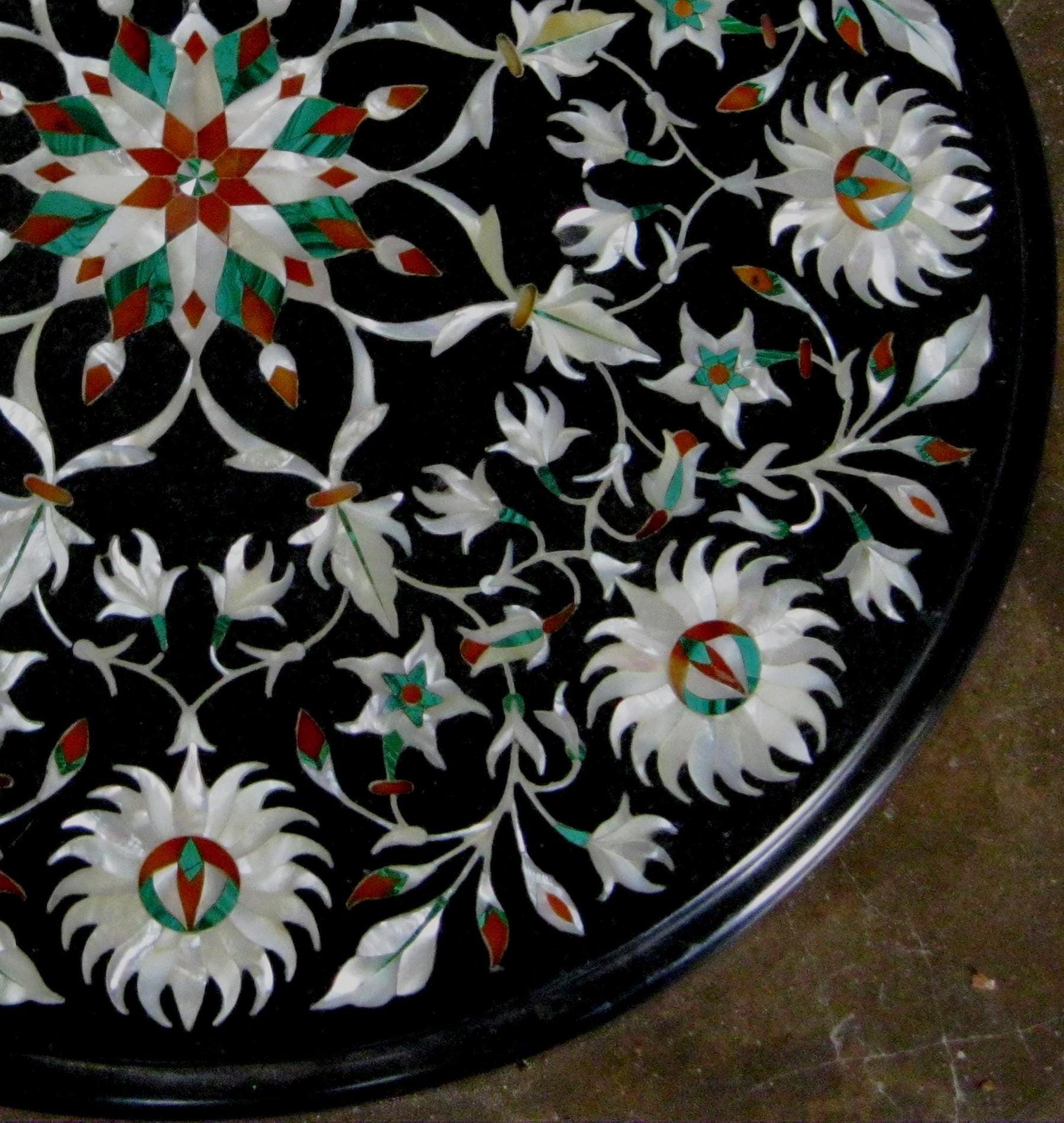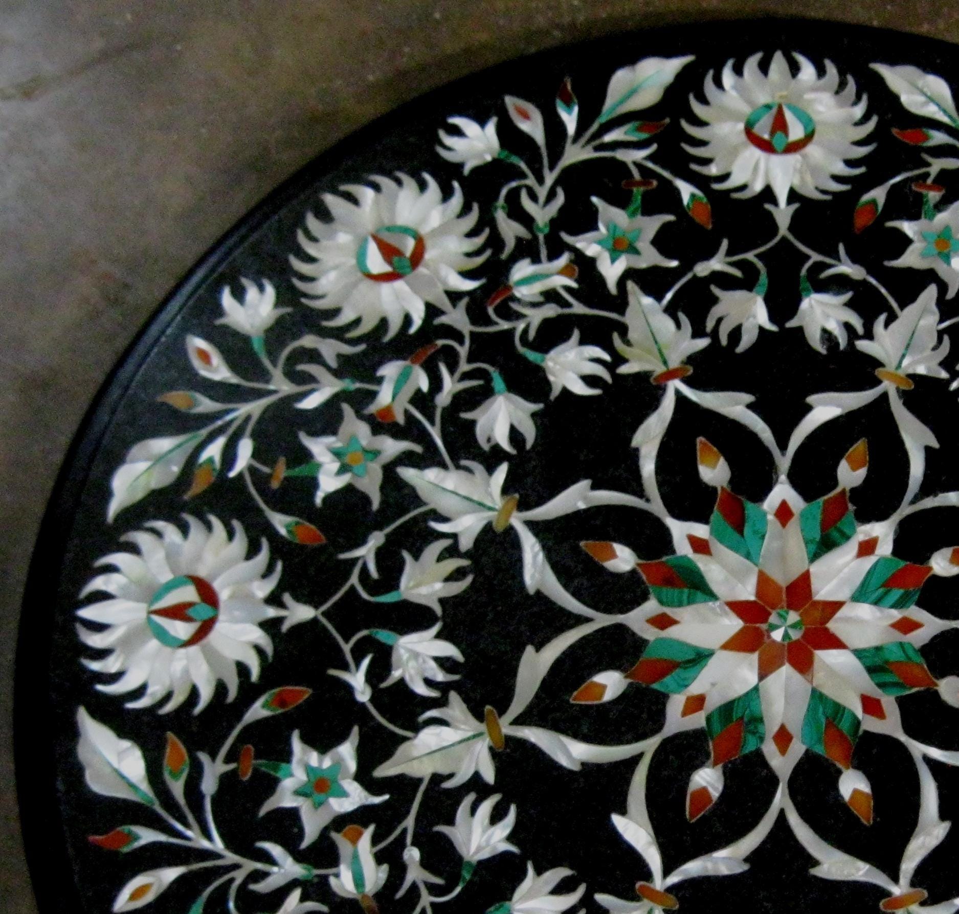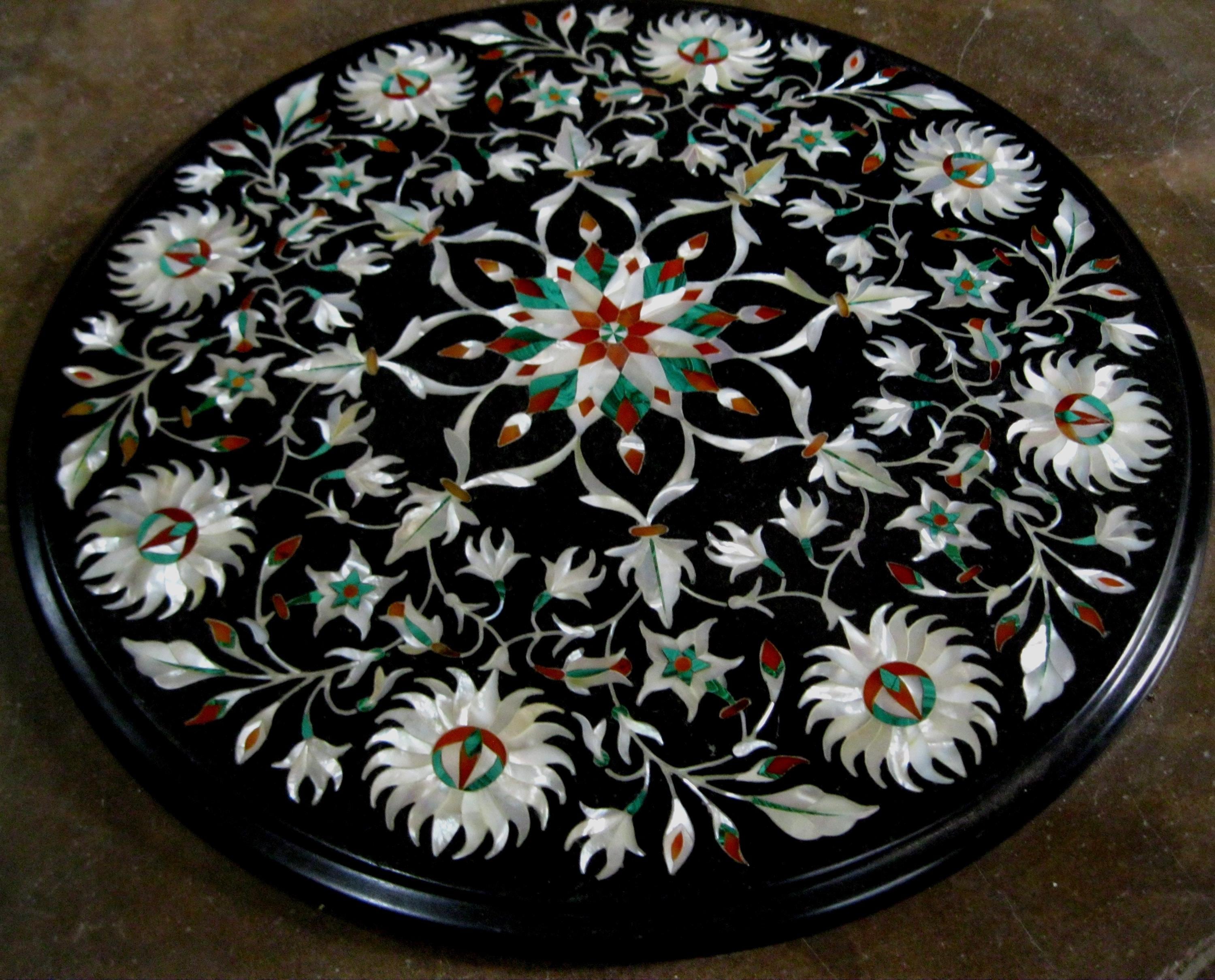 Round Black Marble Floral Inlay Table Top | Handmade Pietra Dura Stone Art