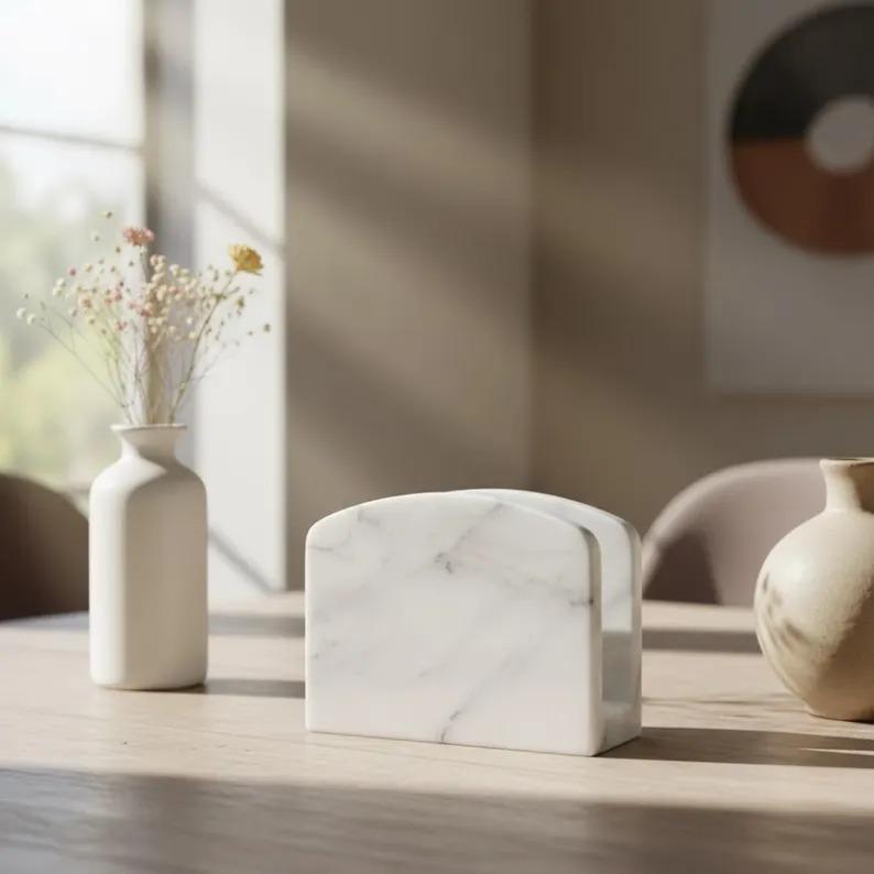 Each piece is made from genuine white marble, making every napkin holder unique with natural variations in veining and color.