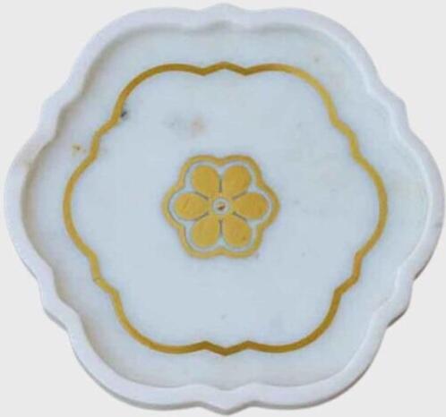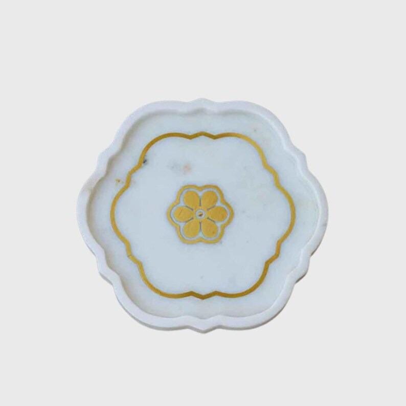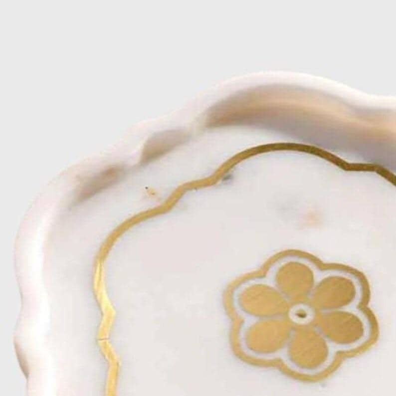 Handcrafted White Marble Tray | Brass Inlay Floral Design | Elegant Table Decor