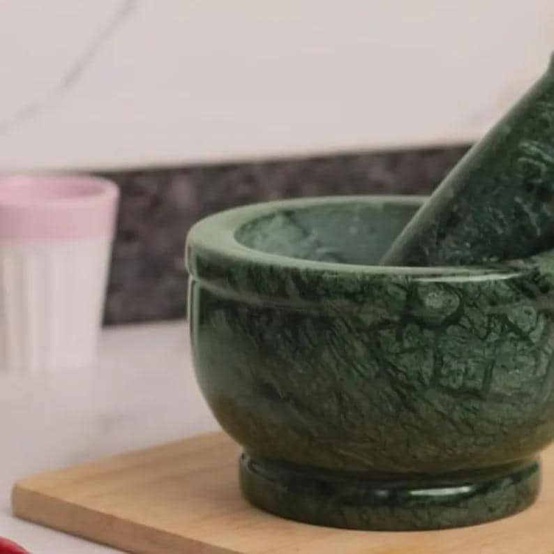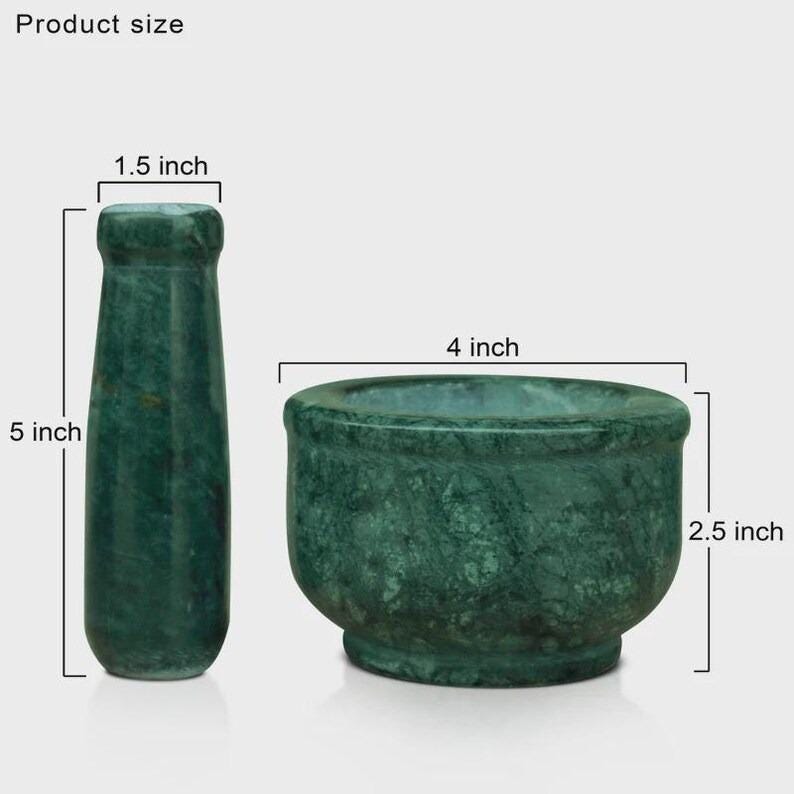 Grind, crush, and blend with timeless elegance using this green marble mortar and pestle set. Crafted from solid natural stone, this durable kitchen essential combines functionality with striking beauty.