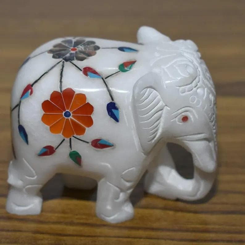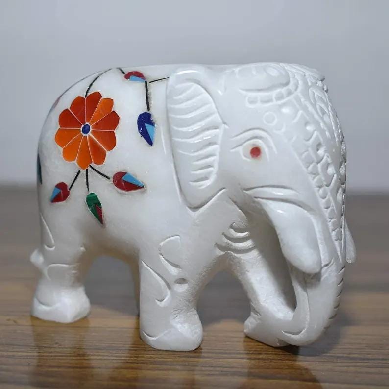 Add charm and positive energy to your space with this beautifully handcrafted white marble elephant figurine. Symbolizing strength, wisdom, and good fortune, this decorative piece is detailed with vibrant floral inlay work that brings color and artistry to natural stone.